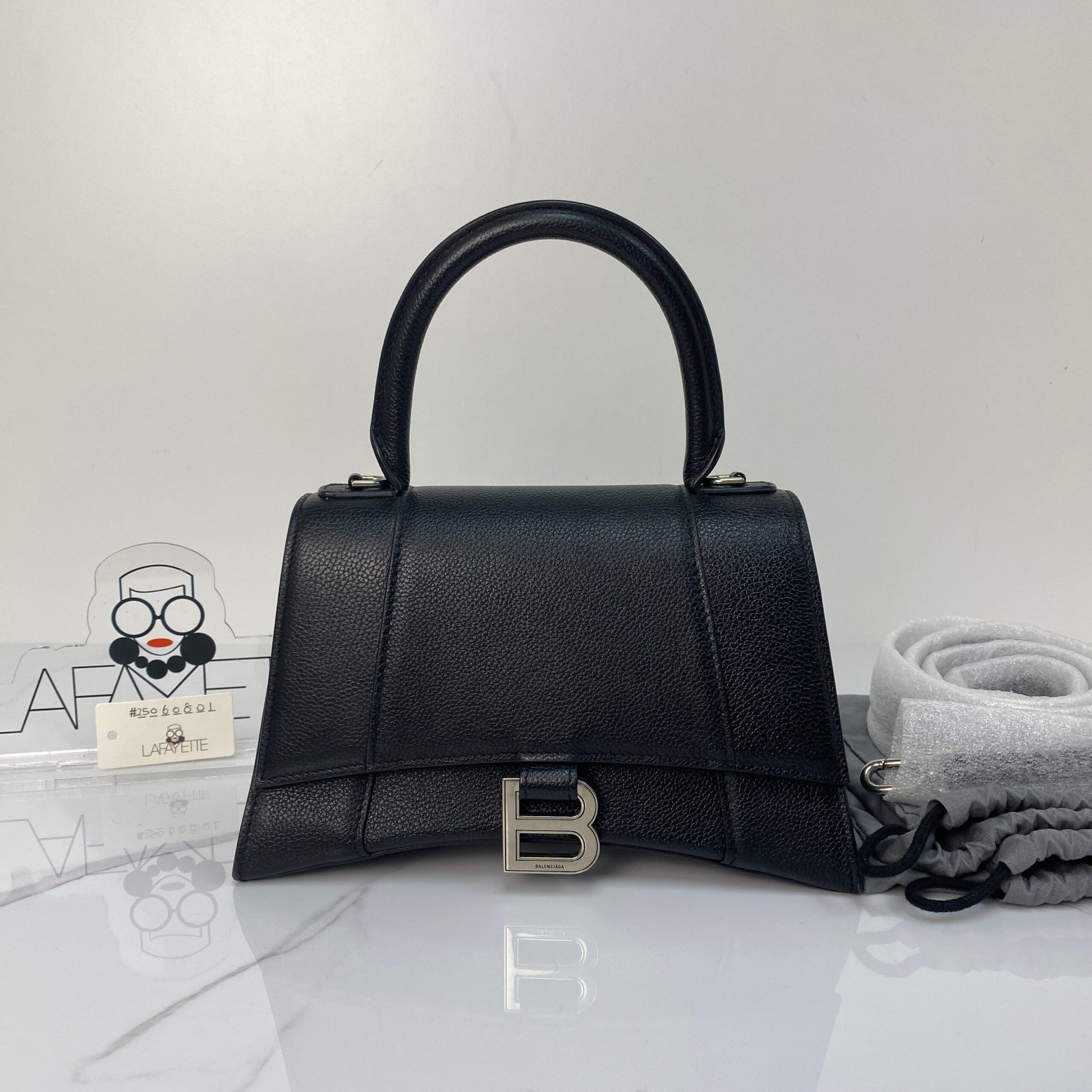 The Small Hourglass in sleek black calfskin is the ultimate wardrobe chameleon—sharp with blazers, edgy with denim, and flawless after dark. Its sculptural shape adds instant polish, no matter how you style it.