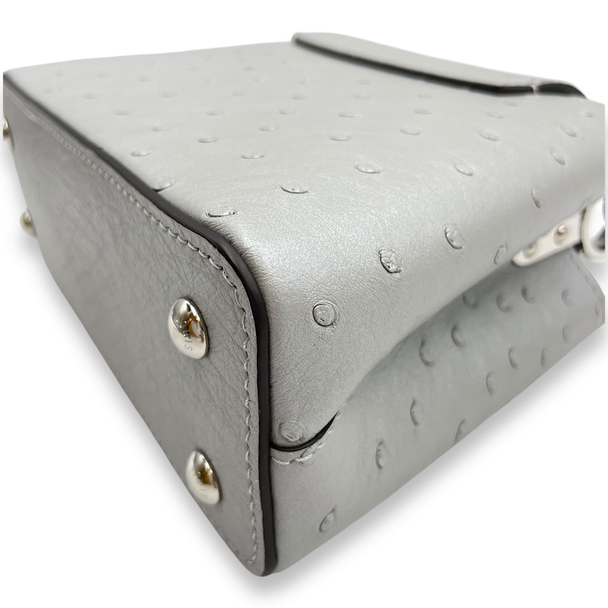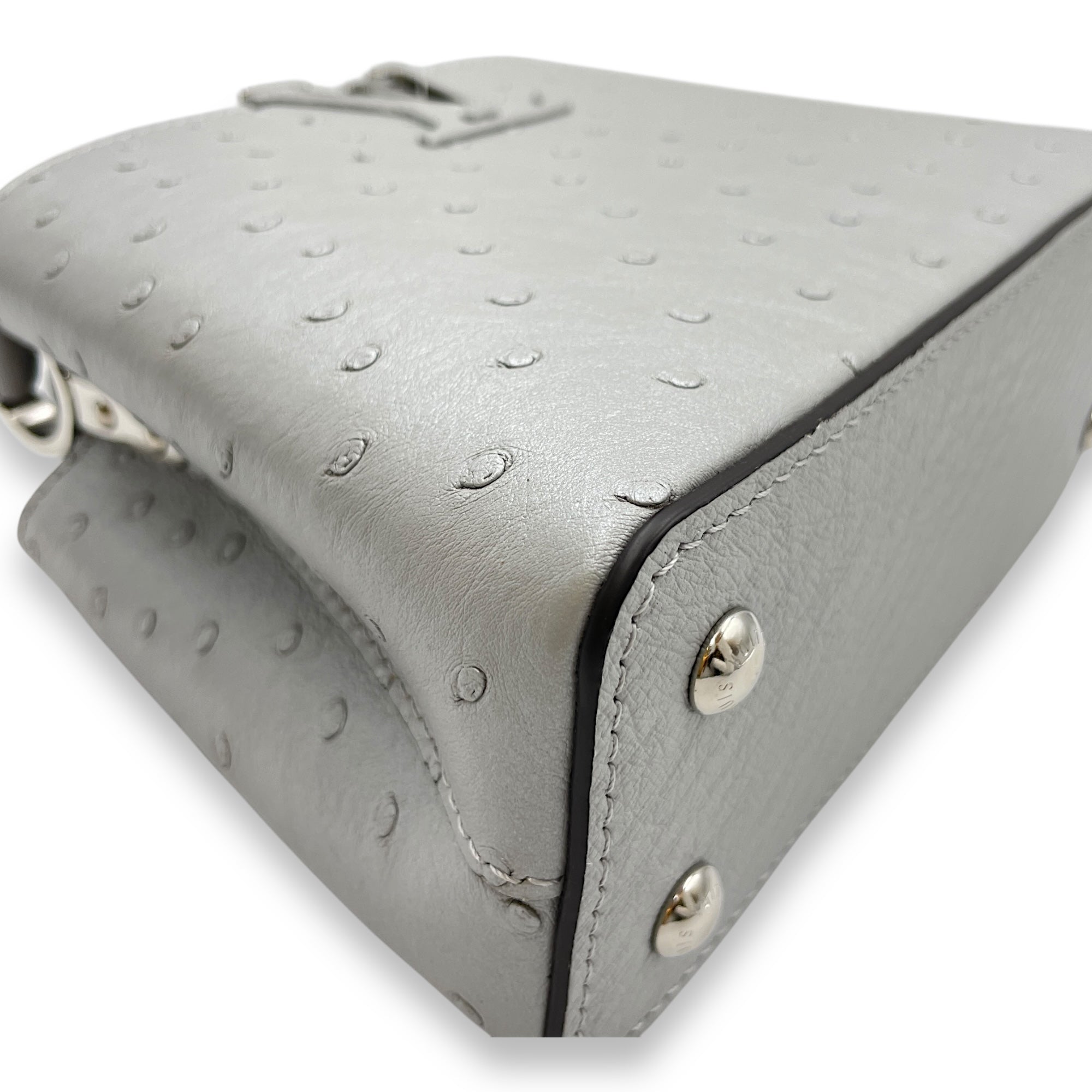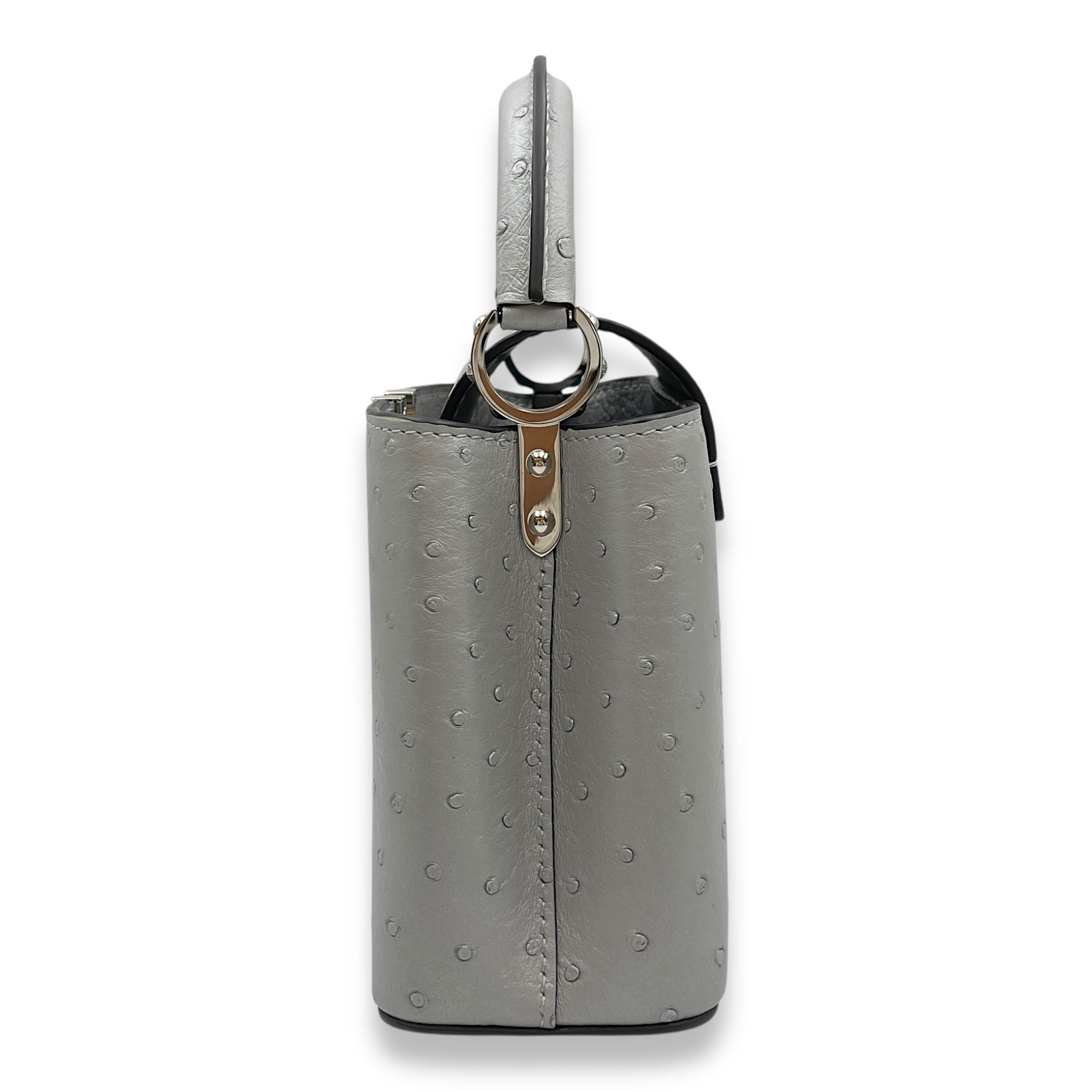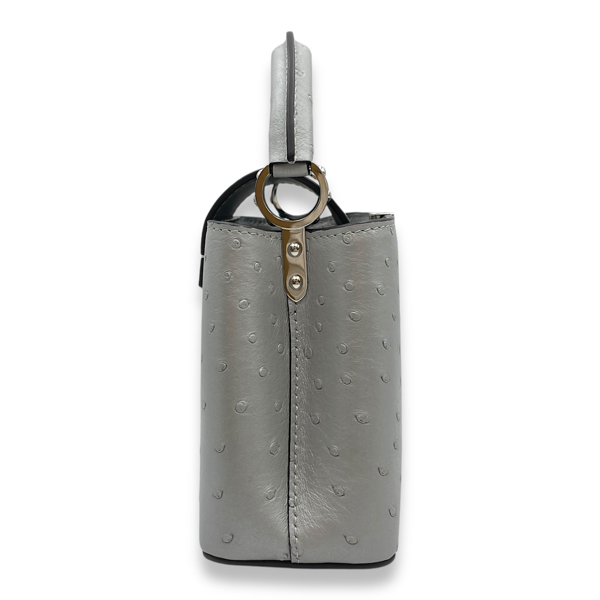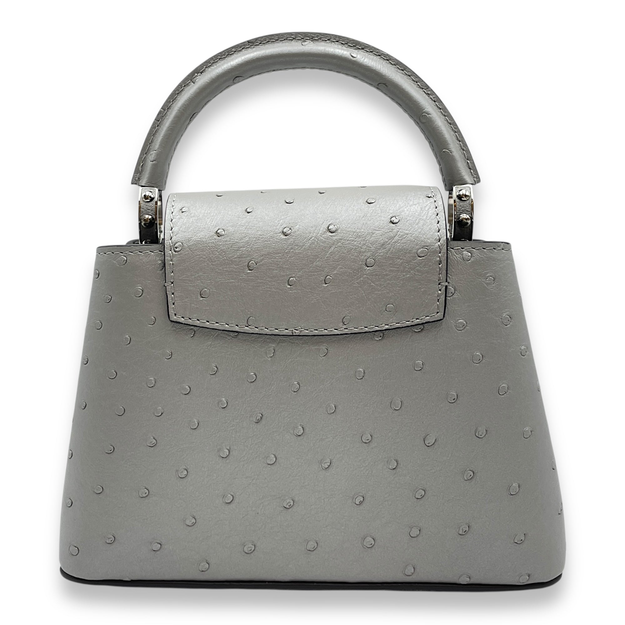 Capucines Mini Grey Top Handle Bag in Ostrich, Silver hardware