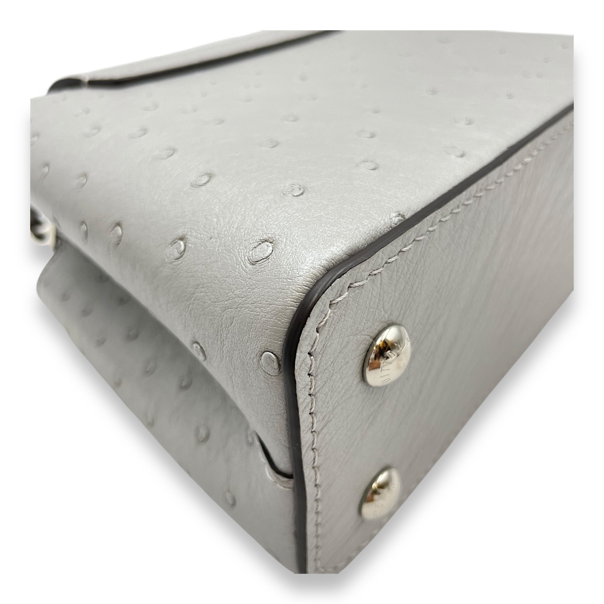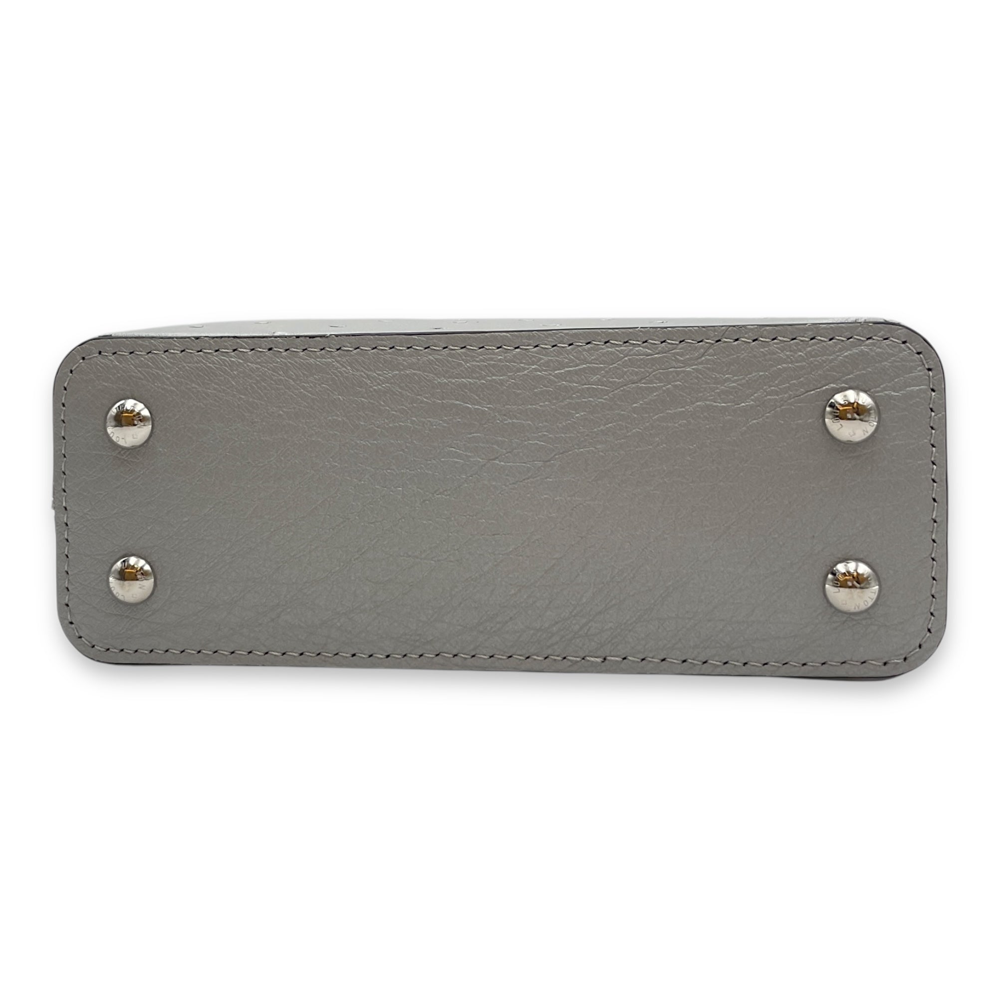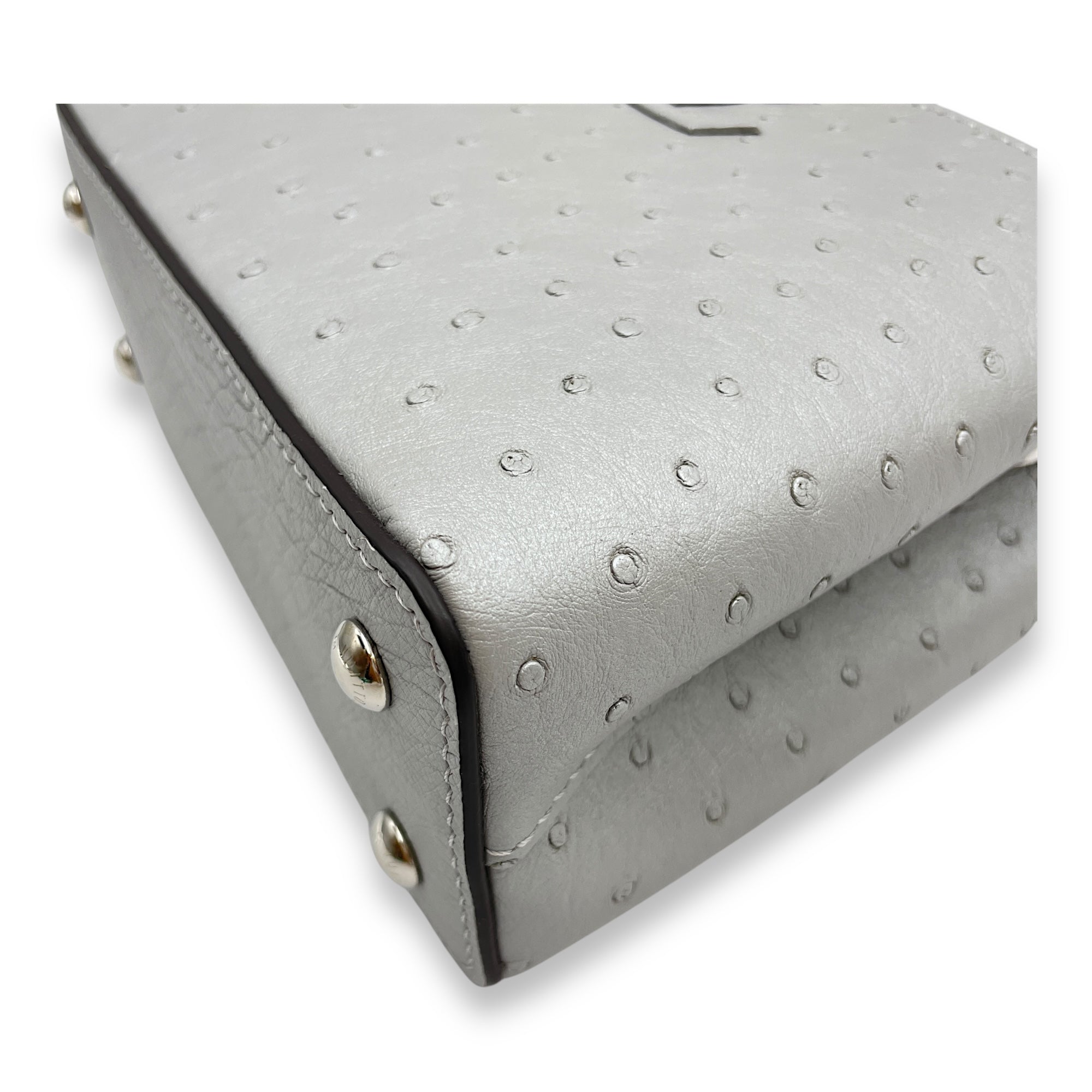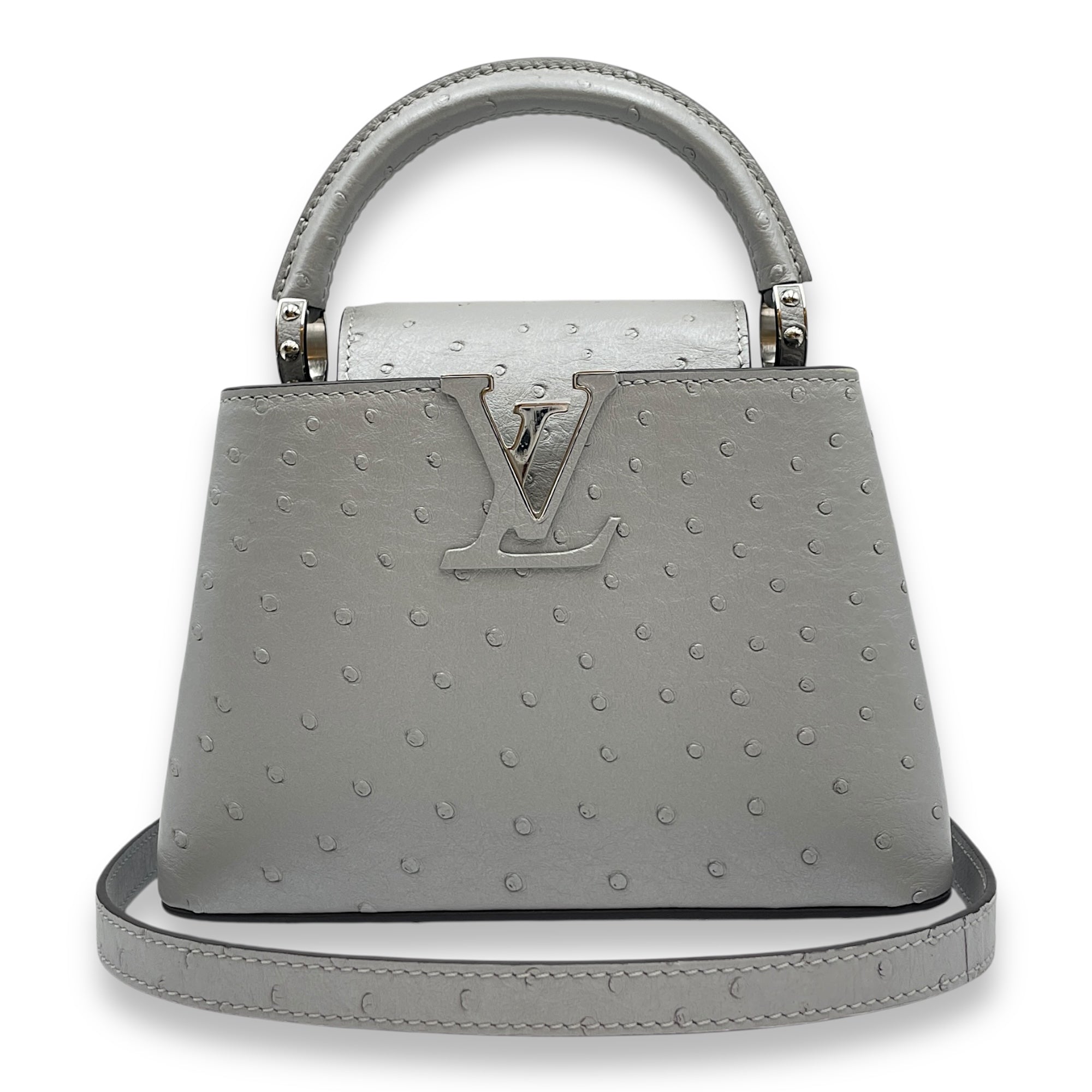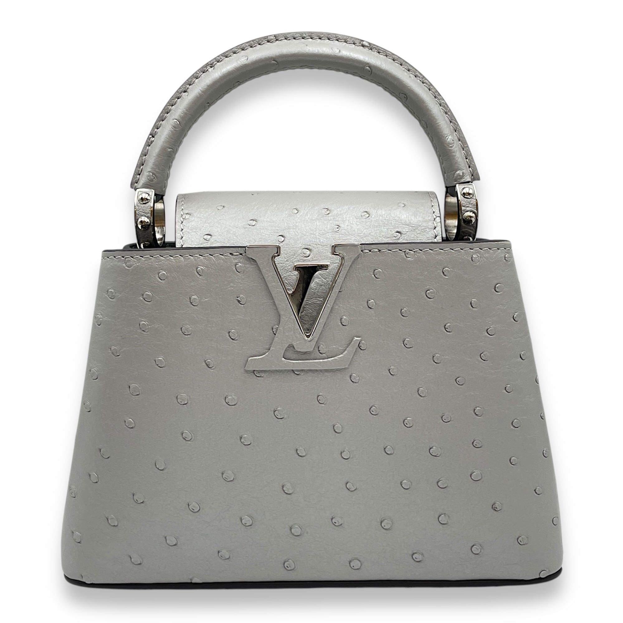 Capucines Mini Grey Top Handle Bag in Ostrich, Silver hardware
