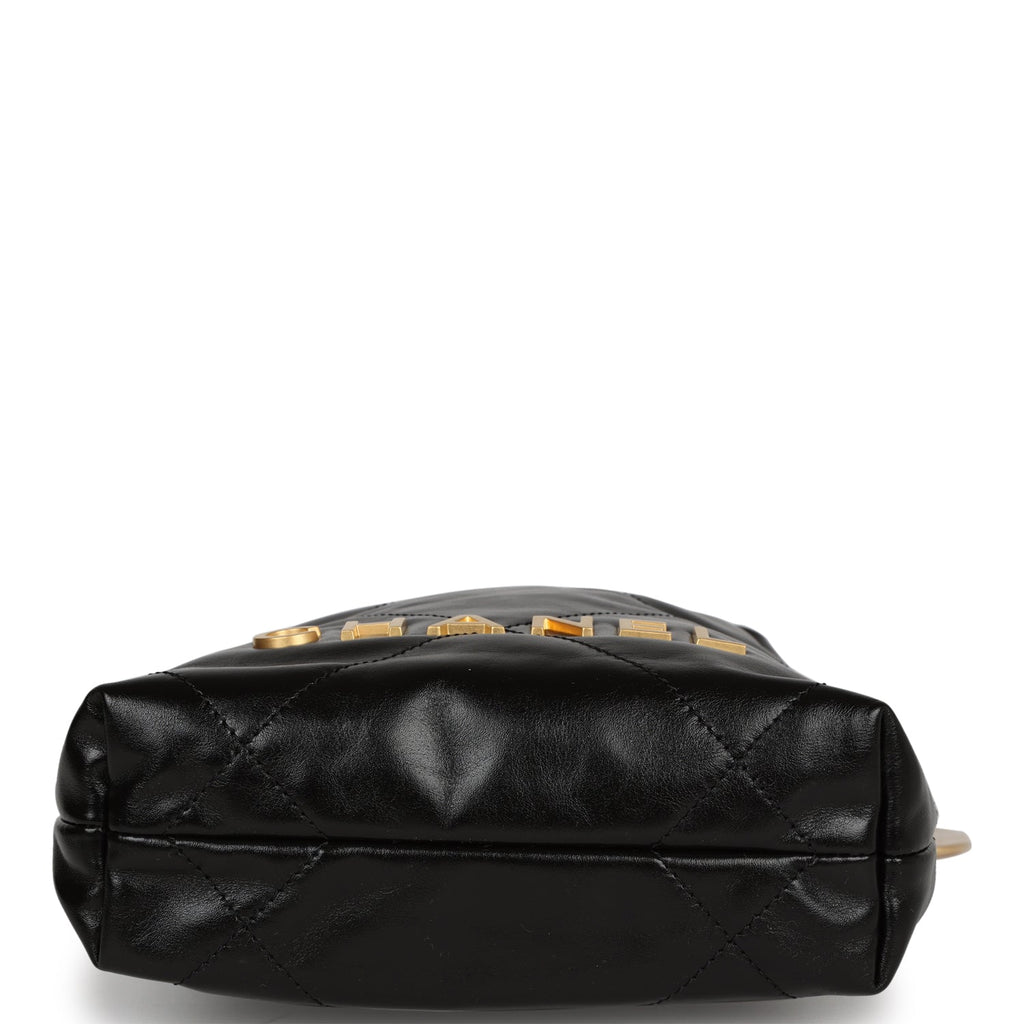 This Mini 22 Hobo Bag is in metallic black calfskin with gold tone hardware, CHANEL on the front in gold tone metal, a short gold tone and leather interwoven chain, a long one, and a long leather cord strap.The interior is lined in Black fabric with one slip pocket on the rear wall.Collection: 23A (RFID chip)Origin: ItalyCondition: New and never wornAccompanied by: Chanel box, Chanel dustbag, carebook, retail UPCMeasurements: 7.8″ width x 7.4″ height x 2.3″ depth; 21″ strap drop