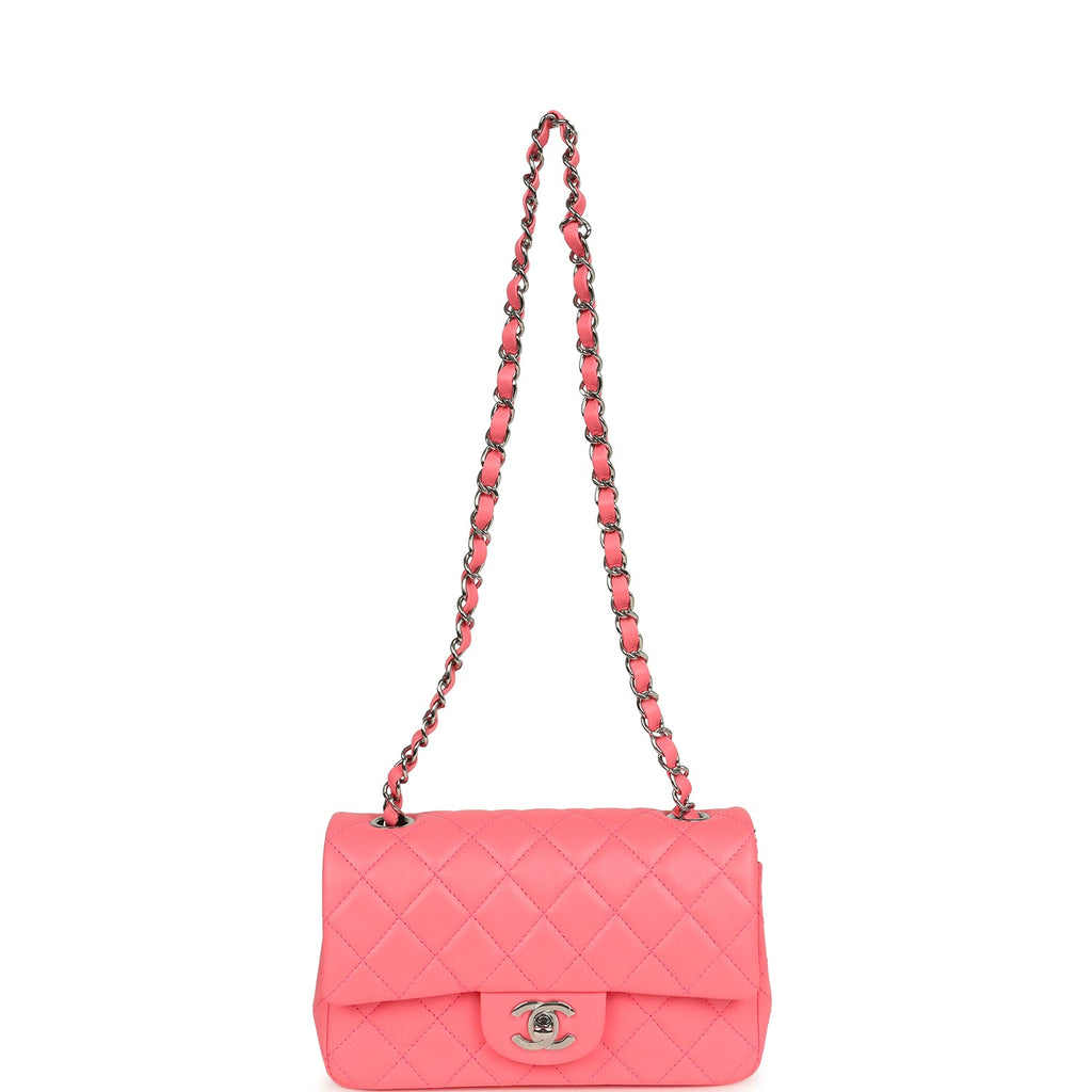 Chanel Mini Rectangular Flap Bag Pink Lambskin Silver Hardware Shop for an authentic Chanel Mini Rectangular Flap in pink lambskin leather with silver tone hardware in new and never worn condition at Madison Avenue Couture.