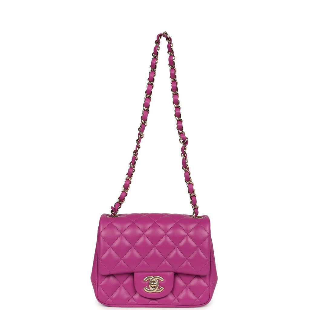 Chanel Mini Square Flap Bag Purple Lambskin Gold Hardware Shop for an authentic Chanel Mini Classic Square Flap Bag in purple lambskin with gold hardware in new and never worn condition at Madison Avenue Couture.