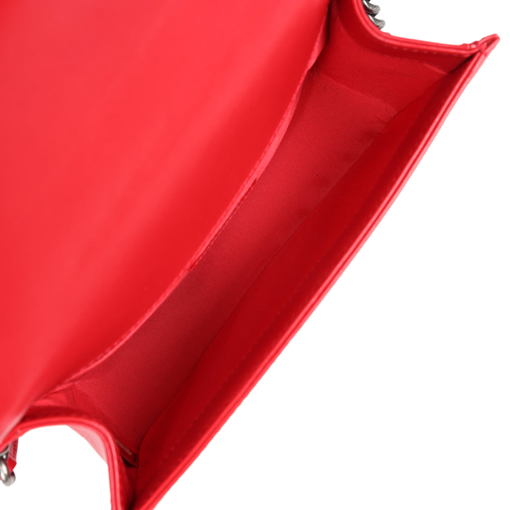 This Chanel Old Medium Boy Bag is in red lambskin leather with aged ruthenium hardware, featuring tonal stitching, geometric quilt printed leather, front flap with Le Boy CC push closure, smooth leather trim, and aged ruthenium chainlink and leather shoulder strap.The interior is lined in red grossgrain fabric and has one slit pocket on rear wall.Collection: 21-series (2015-2016)Origin: FranceCondition: Never wornAccompanied by: Chanel box, Chanel dustbag, felt, carebook, COA CardMeasurements: 9.8″ width x 5.9″ height x 3.5″ depth; 22″ strap drop (12″ doubled)