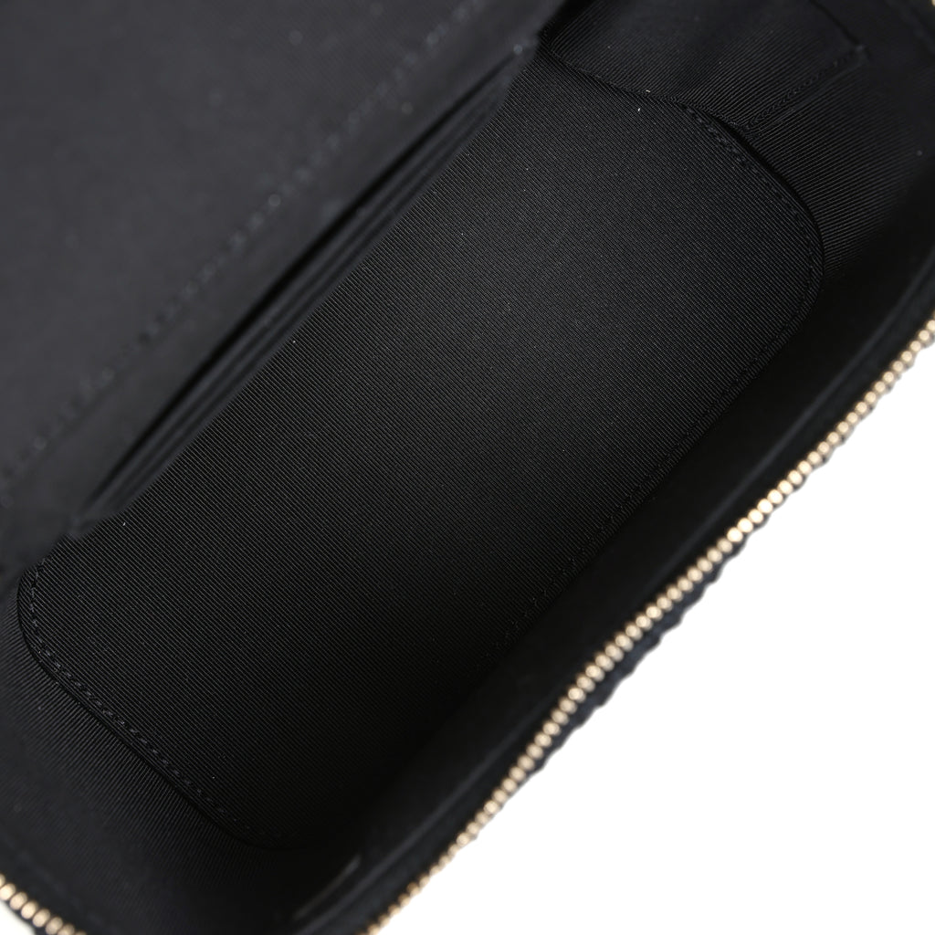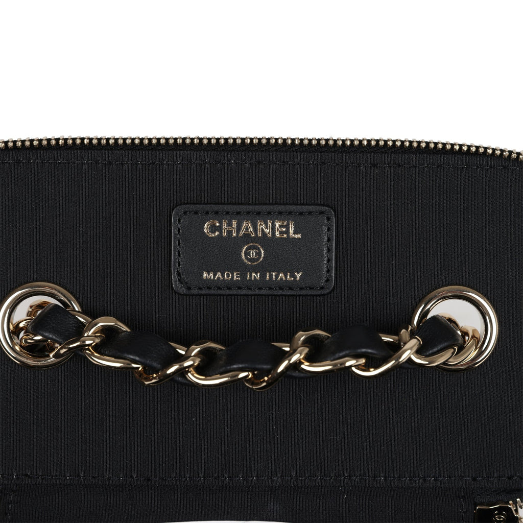 This Small Vanity Case is in black crochet fabric and lambskin with light gold hardware, a signature CC, a double zip around closure, and a long interwoven gold tone chain link and black leather shoulder/crossbody strap.The interior is lined with black fabric with one lipstick compartment and one slip pocket on the rear wall.Collection: 22COrigin: ItalyCondition: New and never worn (plastic on hardware)Accompanied by: Chanel box, Chanel dustbag, retail UPC, carebook, and COA cardMeasurements: 6.5″ width x 4″ height x 3″ depth; 22.5″ handle drop