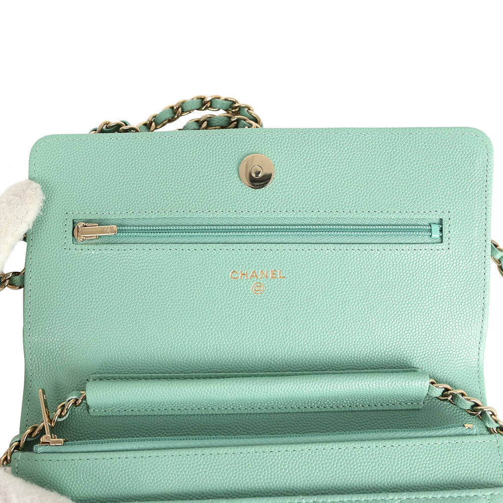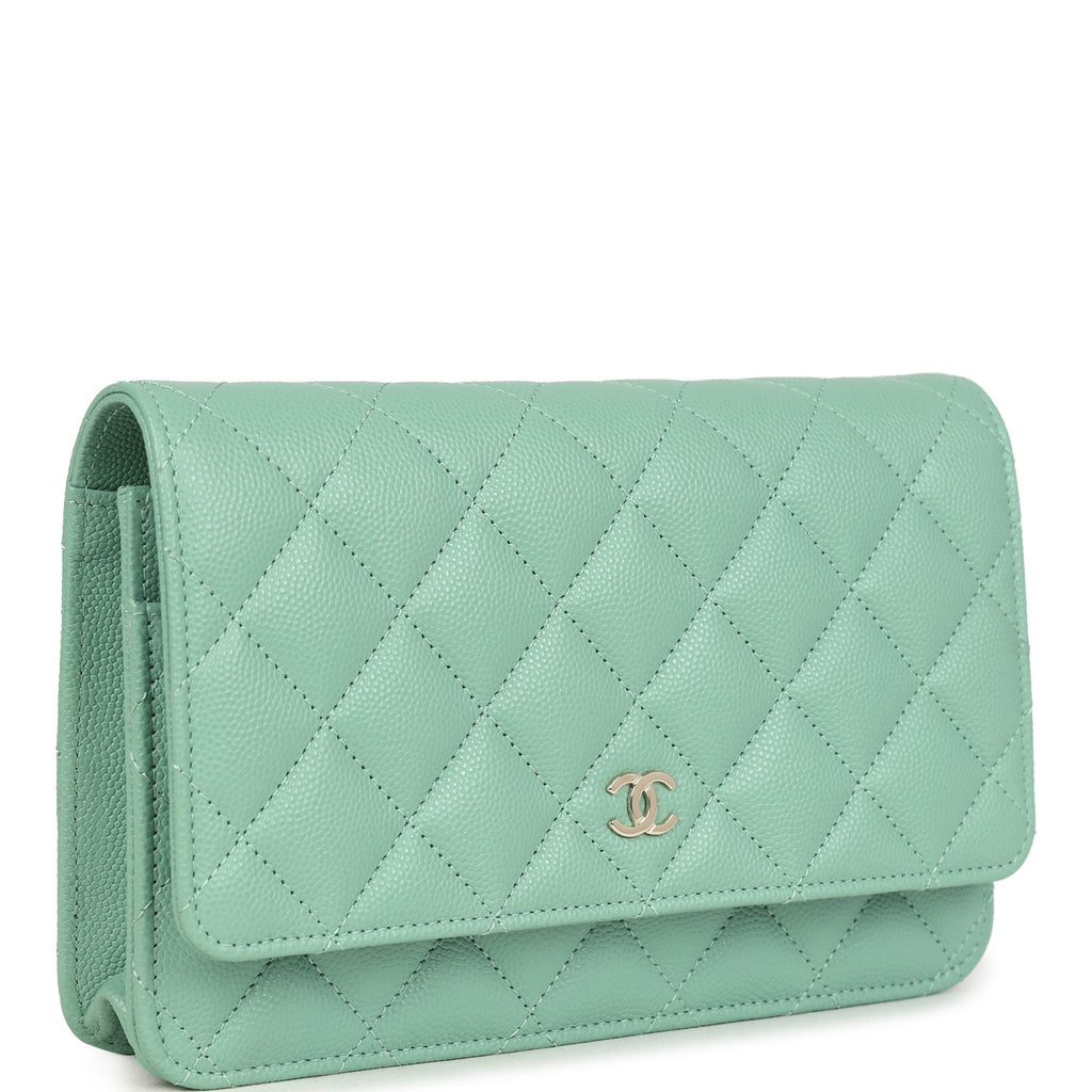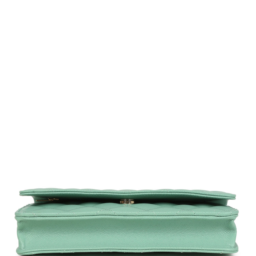 Chanel Wallet On Chain WOC Light Green Caviar Light Gold Hardware Shop for an authentic Chanel classic wallet on chain in light green caviar with light gold hardware in new and never worn condition at Madison Avenue Couture.