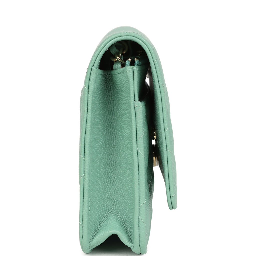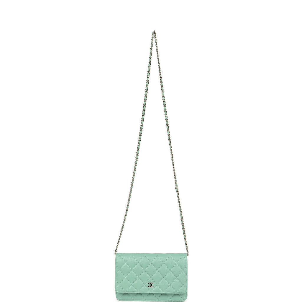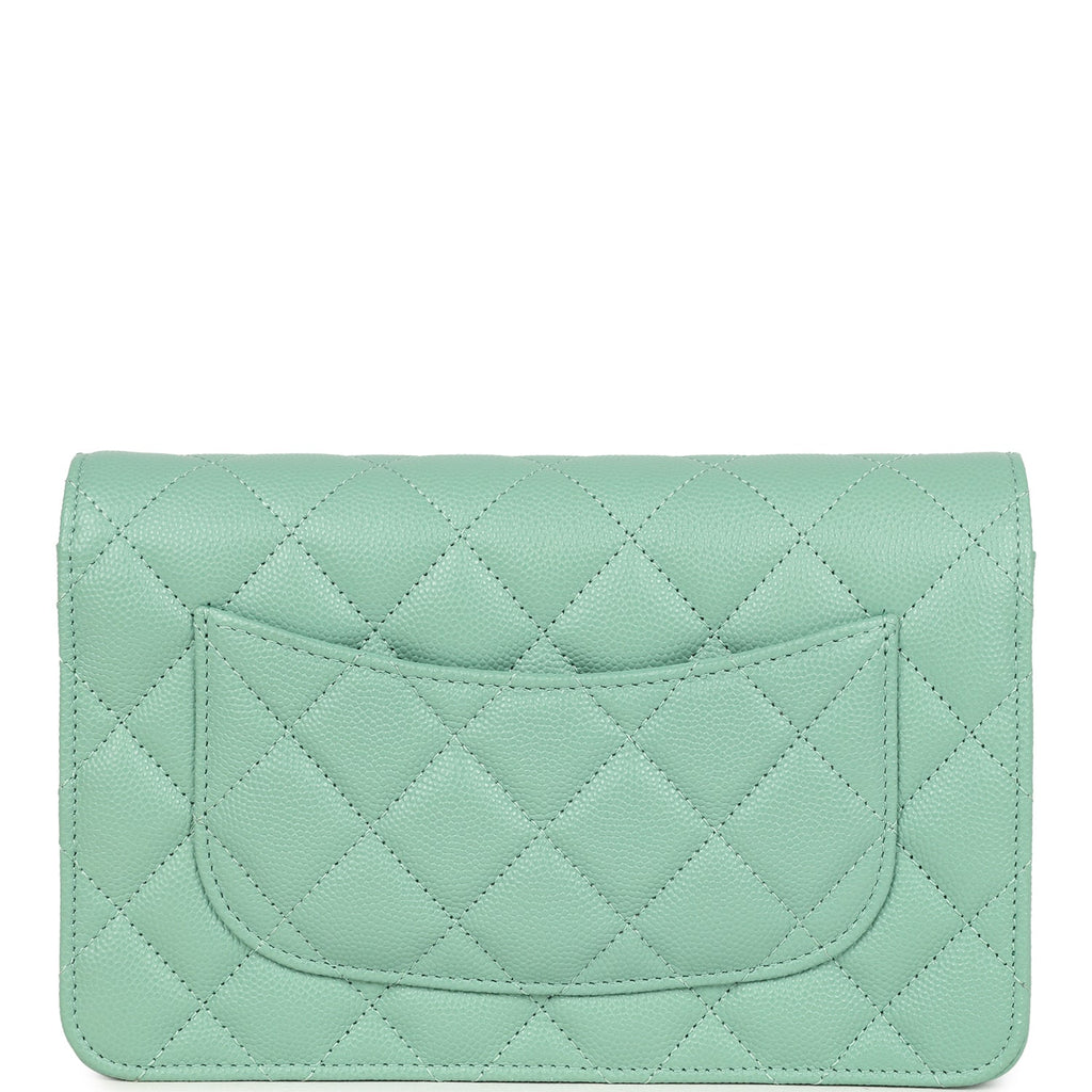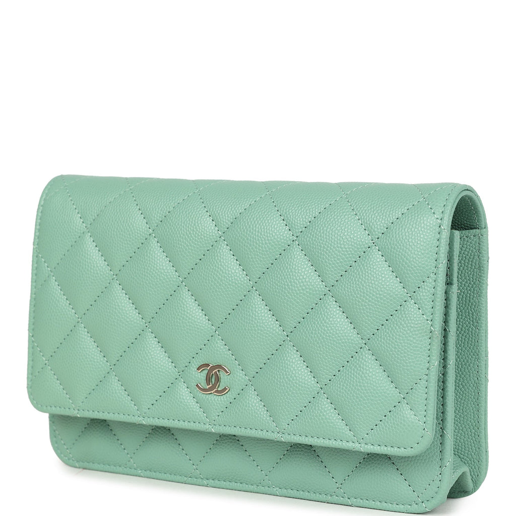 Chanel Wallet On Chain WOC Light Green Caviar Light Gold Hardware Shop for an authentic Chanel classic wallet on chain in light green caviar with light gold hardware in new and never worn condition at Madison Avenue Couture.