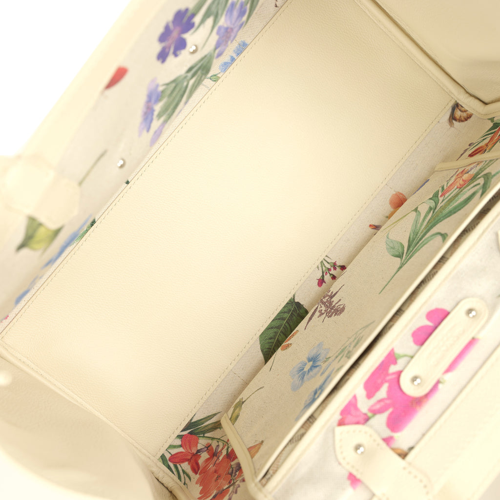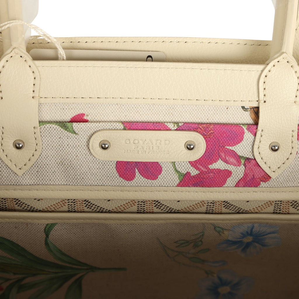 This 2025 limited edition Goyard Souple Saigon Tote in Sand Goyardine coated canvas and Chevroches calfskin leather with palladium hardware, tonal stitching, features two double rolled top handles, signature Saigon leather strap and loop closure, a cutout in the top of the flap for the handle to fit through.The interior is lined is multicolored floral printed canvas and Sand Chevroches calfskin leather and a single floating pocket and a wooden detail on back of bag with palladium studs.Origin: FranceCondition: New and never worn (plastic on handles)Accompanied by: Goyard box, Goyard dustbag, carebook, retail tag, felt, ribbonMeasurements: 13″ (17.5″ across the widest part) x 9.5″x 6″; 6″ top handles