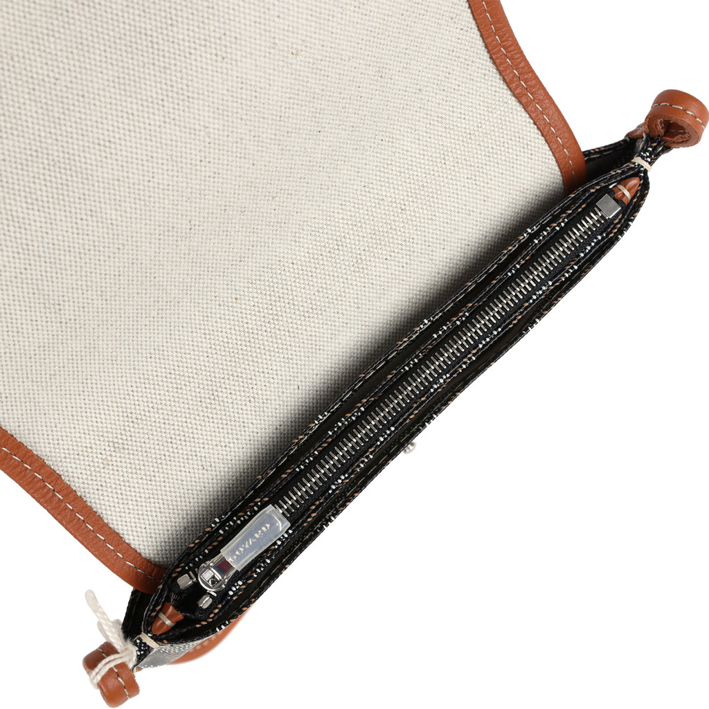 This Goyard Plumet Pocket Wallet is in black Goyardine Canvas and tan Chevroches calfskin leather with palladium hardware, contrast stitching, exterior slip pocket, and a detachable crossbody strap.The interior is lined in white linen and cotton with two main compartments, a center zip pocket divide, and two small slip pockets.Origin: FranceCondition: New and never wornAccompanied by: Goyard dustbag, retail UPC, strap, strap dustbag, carebookMeasurements: 8” x 5.5″ x 1″