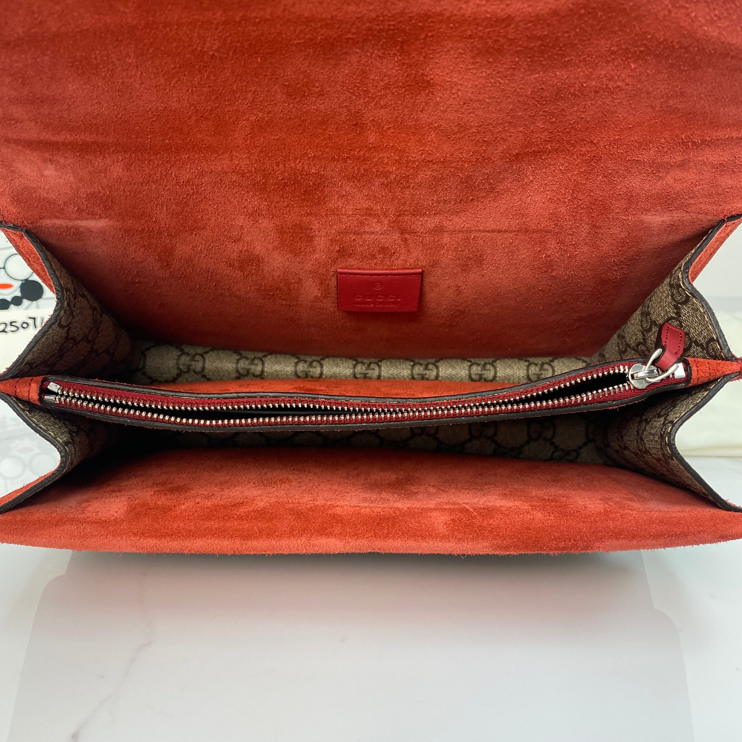 Bold yet timeless—the Gucci Dionysus Shoulder Bag in monogram canvas with red suede accents brings standout style to any look. Dress it up with tailoring or down with denim—this bag does it all.