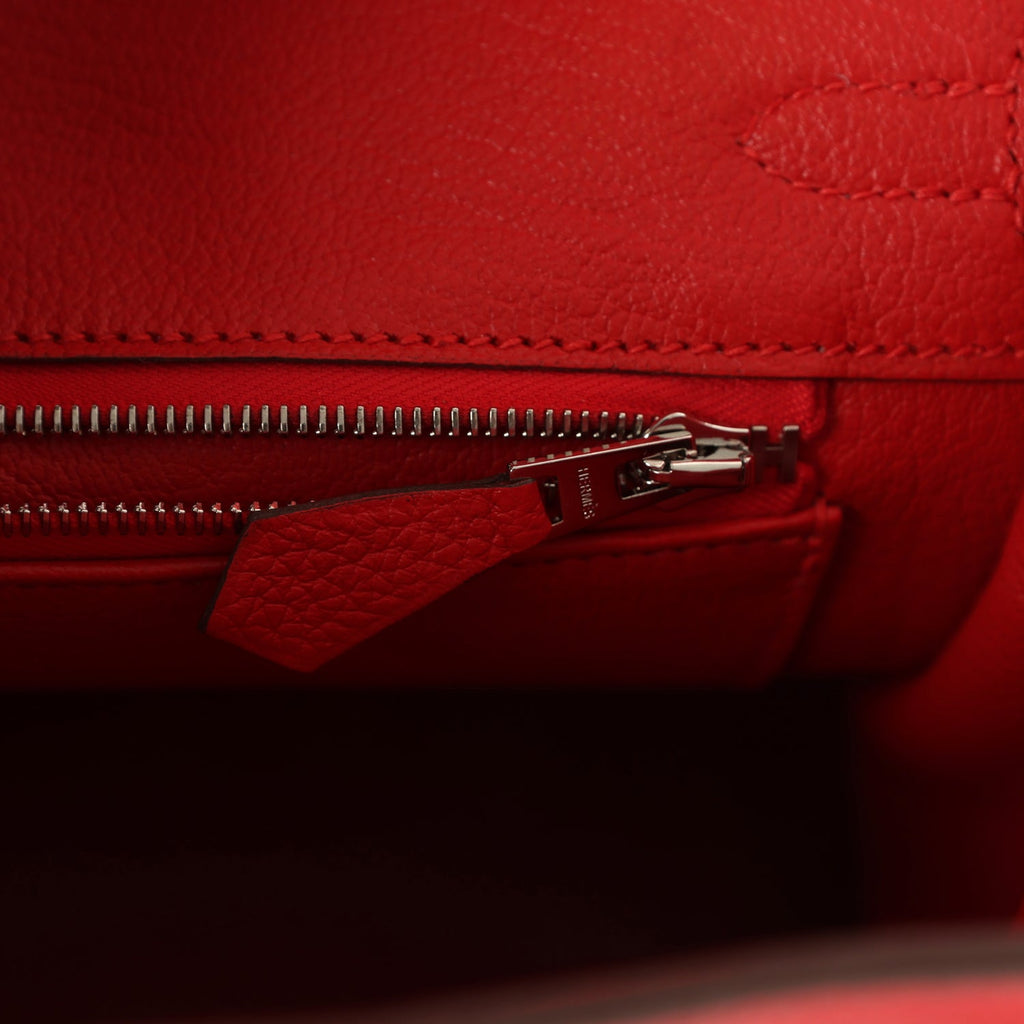 This Birkin is in Rouge Radieux togo leather with palladium hardware and has tonal stitching, front flap, two straps with center toggle closure, clochette with lock and two keys, and double rolled handles.The interior is lined with Rouge Radieux chevre and has a zip pocket with an Hermes engraved zipper pull and an open pocket on the opposite side.Collection: K (2025)Origin: FranceCondition: New and never worn (plastic on hardware)Accompanied by: Hermes box, Hermes dustbag, felt, lock, two keys, clochette, clochette dustbag, carebook and ribbonMeasurements: 10″ width x 7.5″ height x 4.75″ depth; 2.75″ handle drop
