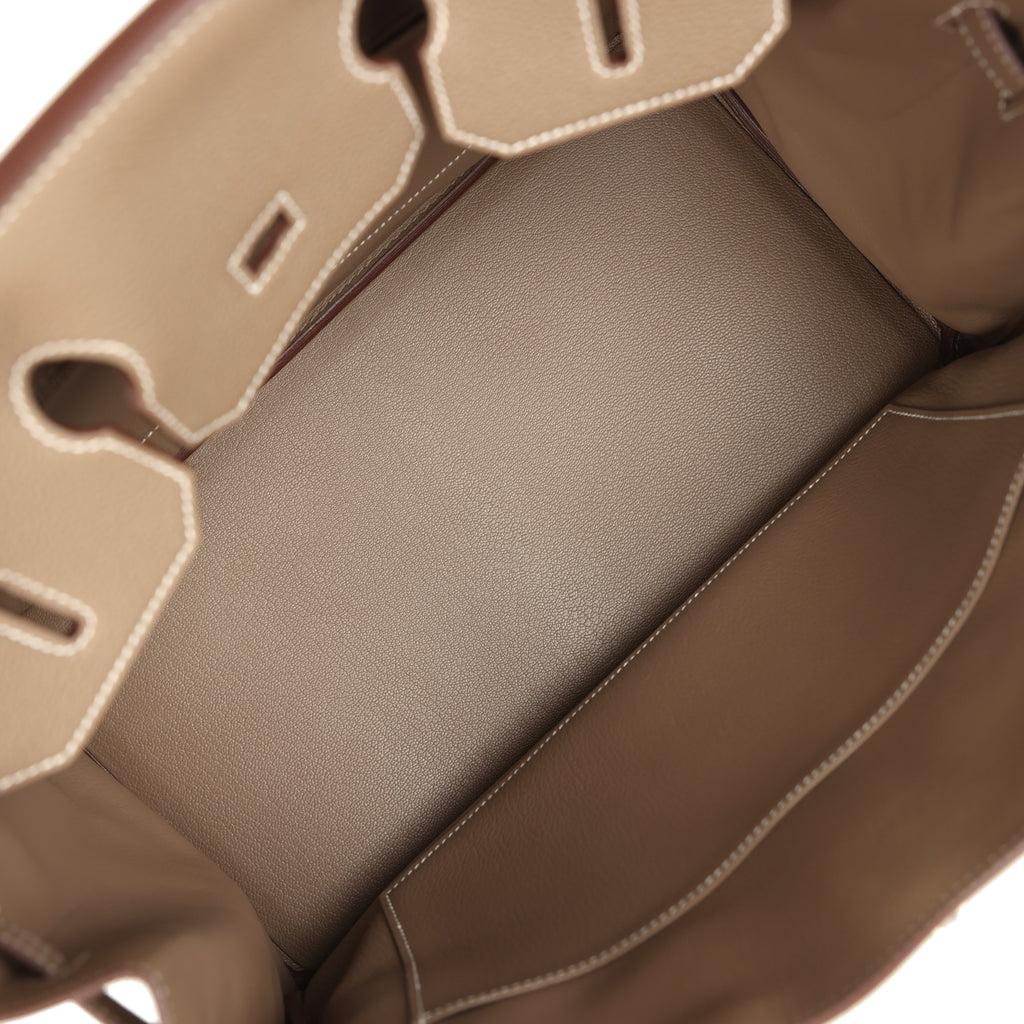 This Birkin is in Etoupe togo leather with brushed palladium hardware and has contrast stitching, front flap, two straps with center toggle closure, clochette with lock and two keys, and double rolled handles.The interior is lined with Etoupe chevre leather and has one zip pocket with an Hermes engraved zipper pull and an open pocket on the opposite side.Collection: K (2025)Origin: FranceCondition: New and never worn (plastic on hardware) Accompanied by: Hermes box, Hermes dustbag, felt, clochette, clochette dustbag, lock, two keys, carebookMeasurements: 13.75″ width x 11″ height x 7″ depth; 4.25″ handle drop