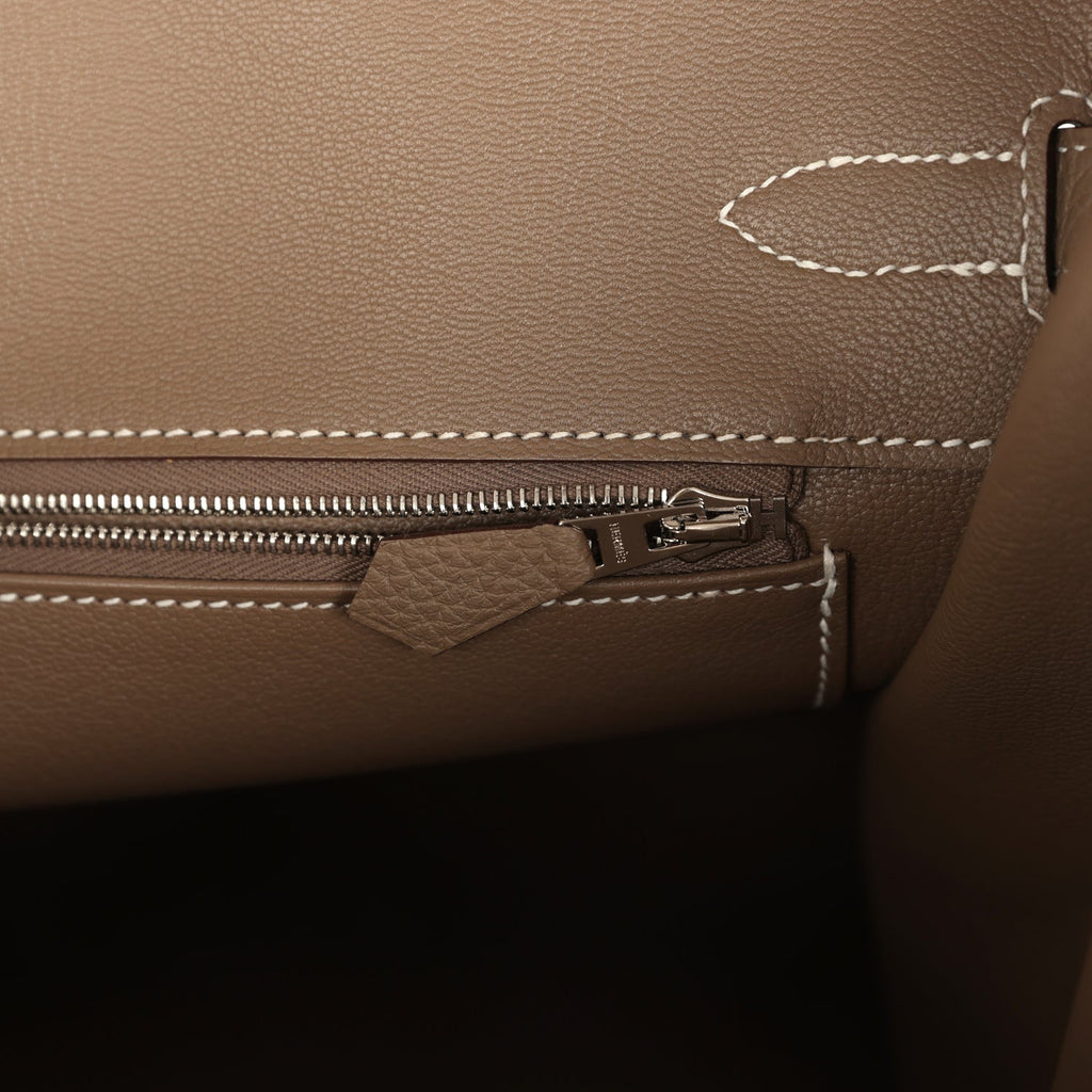 Hermes Birkin 35 Etoupe Togo Brushed Palladium Hardware Shop for an authentic Hermes Birkin 35 in Etoupe togo leather with brushed palladium hardware in new and never worn condition at Madison Avenue Couture.