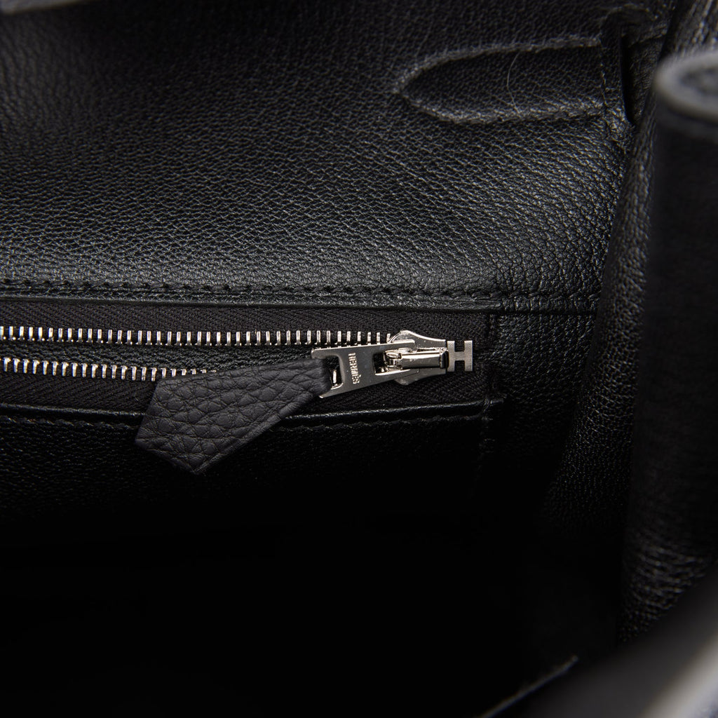 This Birkin is in Black togo leather with palladium hardware and has tonal stitching, two straps with front toggle closure, clochette with lock and two keys and double rolled handles.The interior is lined in Black chevre with one zip pocket with an Hermes engraved zipper pull and an open pocket on the opposite side.Collection: U (2022)Origin: FranceCondition: New and never worn (plastic on hardware)Accompanied by: Hermes box, Hermes dustbag, felt, clochette, lock, two keys, clochette dustbag, carebook, rainhatMeasurements: 15.75″ width x 12.75″ height x 8″ depth; 4.25″ handle drop