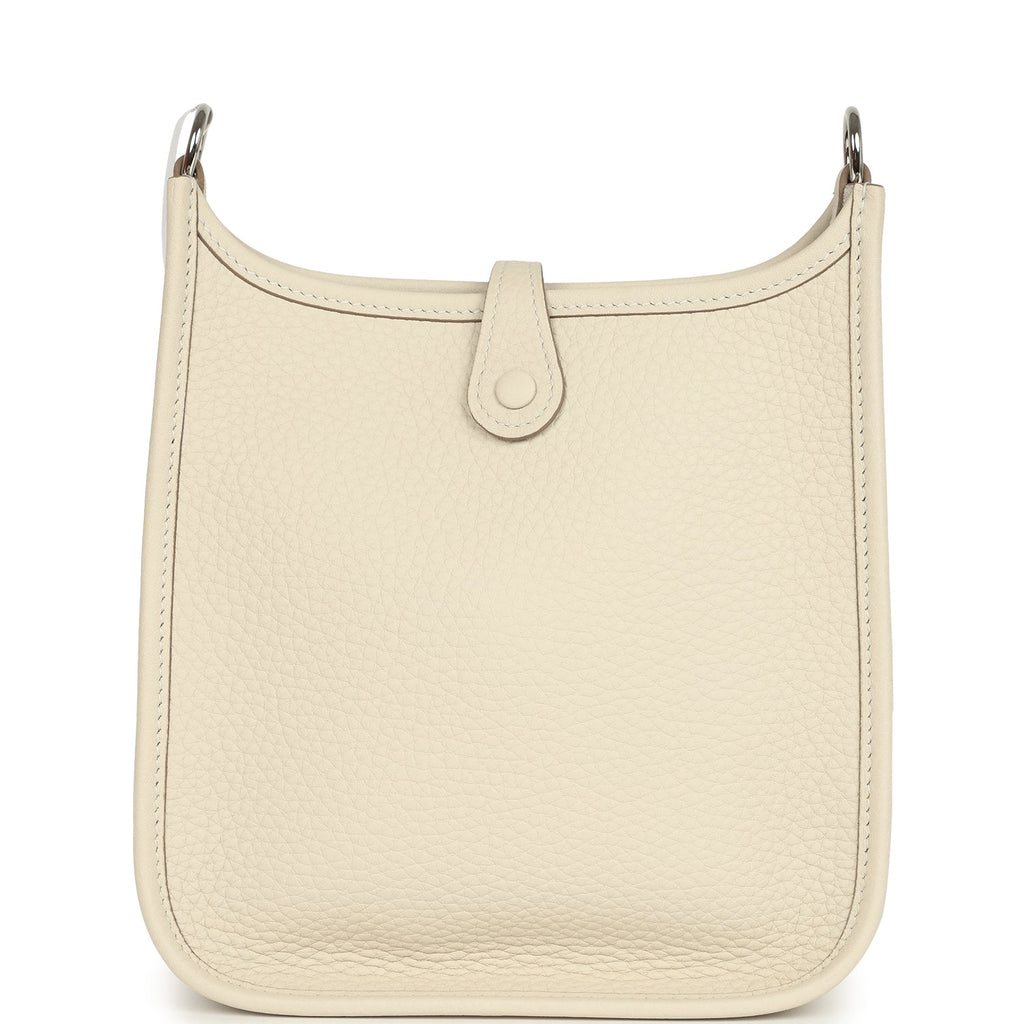 This Evelyne TPM is in Craie clemence leather messenger bag with tonal stitching with palladium hardware, large perforated H in circle (front), pull tab top snap closure and removable Craie canvas and leather shoulder/crossbody strap.The interior is lined in natural suede leather.Collection: K (2025)Origin: FranceCondition: New and never worn (plastic on hardware)Accompanied by: Hermes box, Hermes dustbag, shoulder strap, shoulder strap dustbag, carebook, ribbonMeasurements: 6.75″ x 7” x 2″ ; 23″ strap drop