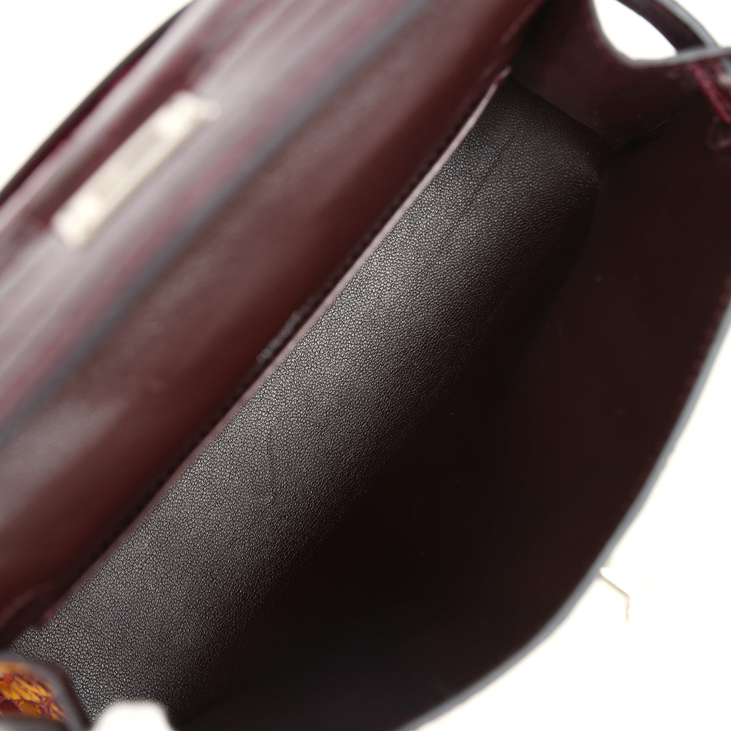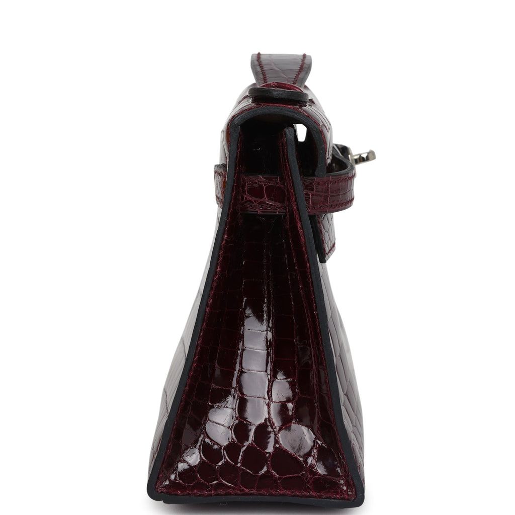 This Mini Kelly Pochette is in Bordeaux Shiny Niloticus Crocodile leather with palladium hardware and has tonal stitching, front flap, two straps with center toggle closure and a top flat handle.