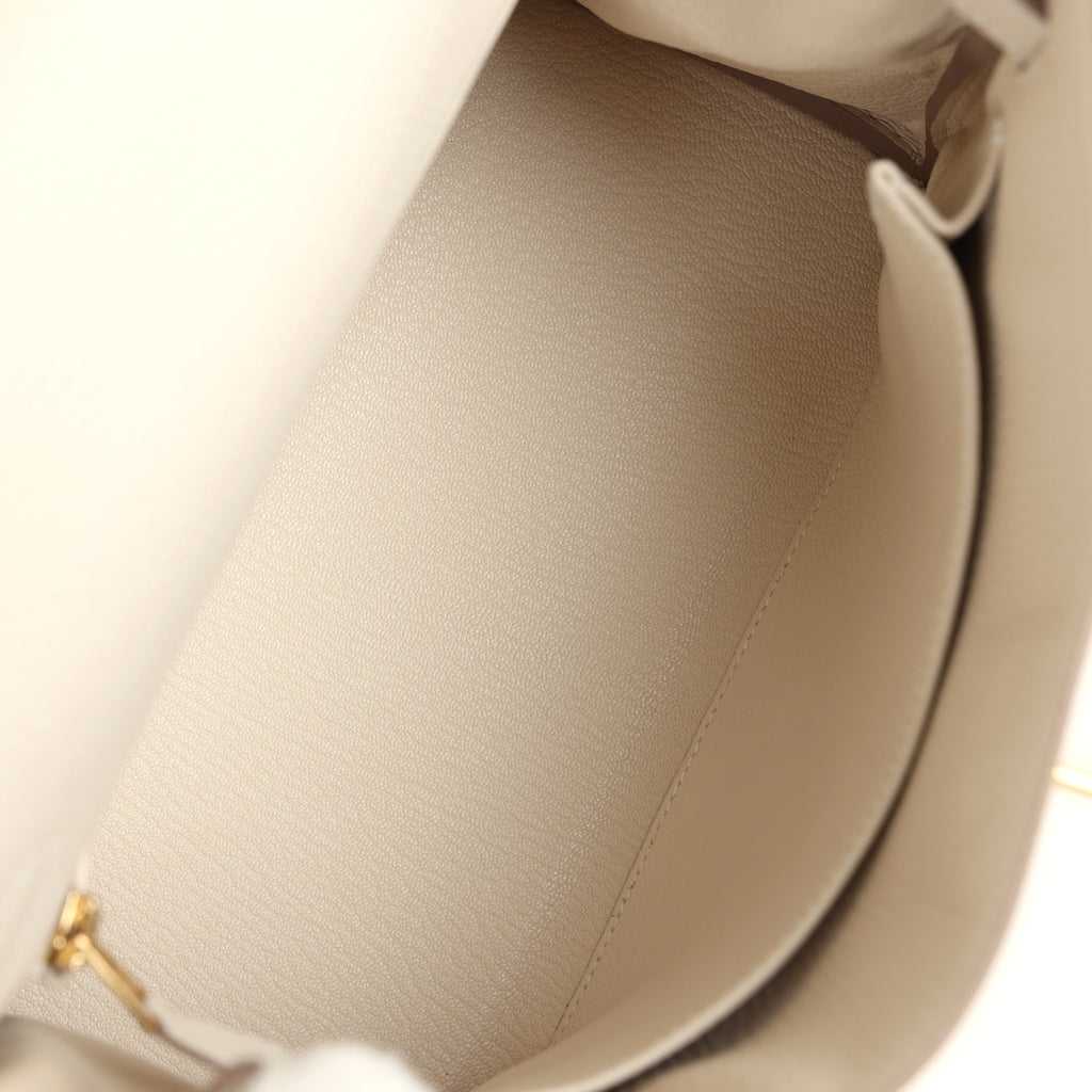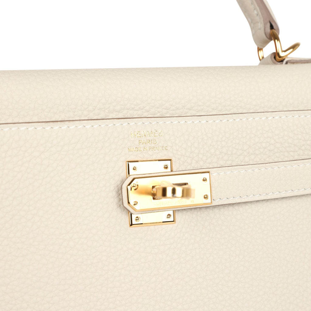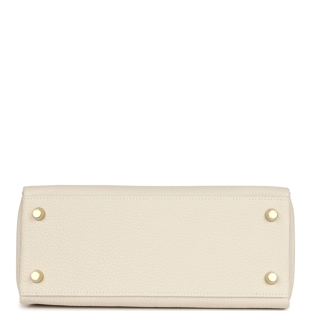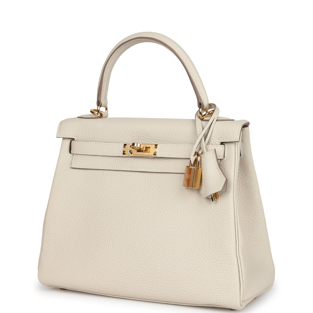 Hermes Kelly Retourne 25 Craie Togo Gold Hardware Shop for an authentic Hermes Kelly Retourne 25 in Craie togo leather with gold hardware in new and never worn condition at Madison Avenue Couture.