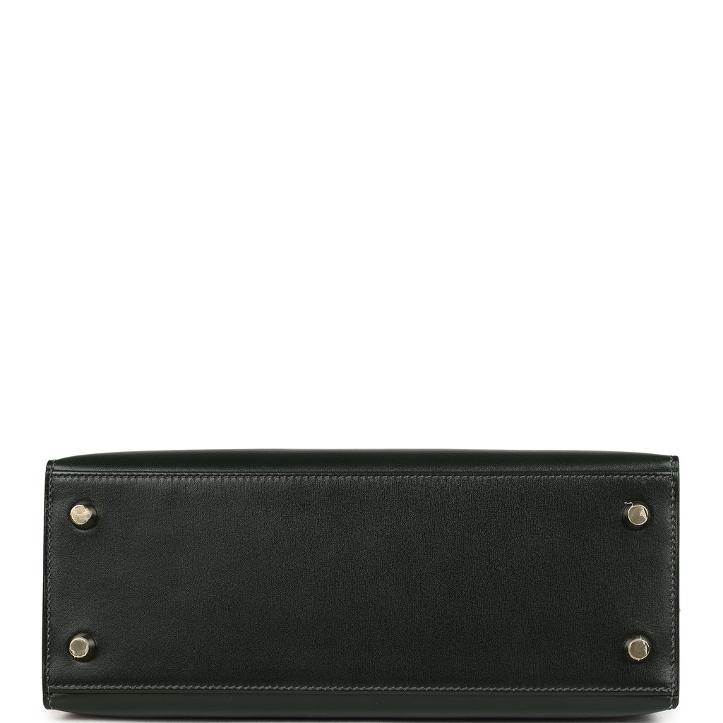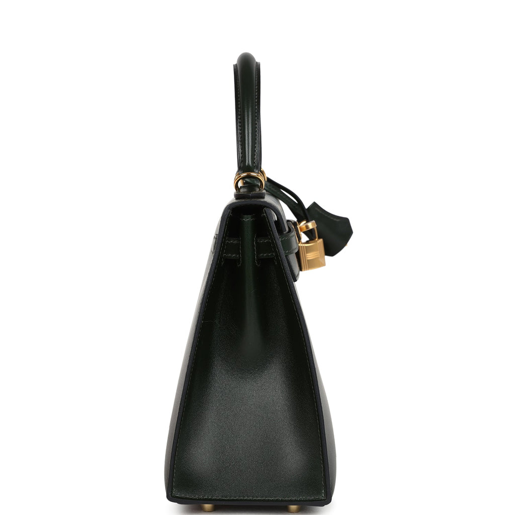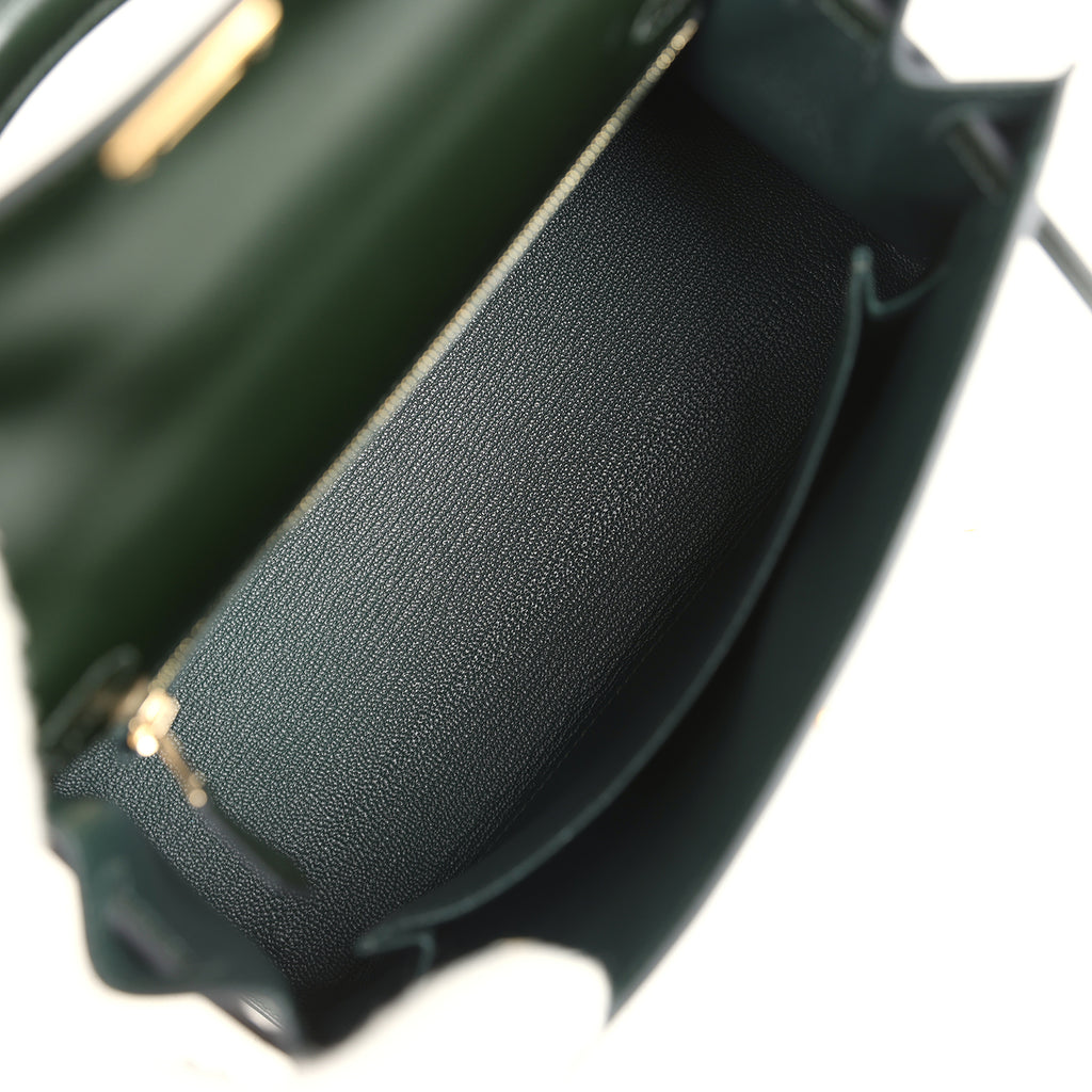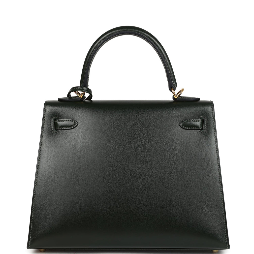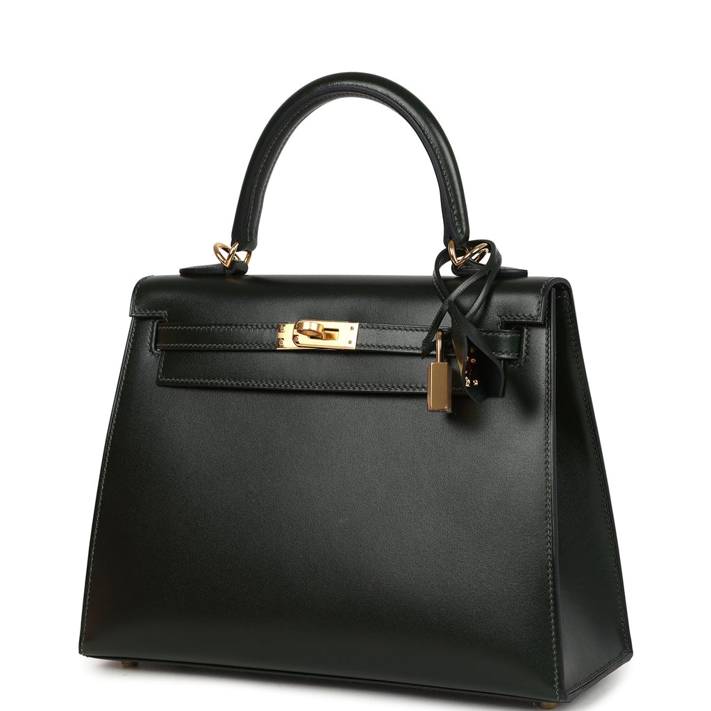 Hermes Kelly Sellier 25 Vert Fonce Box Gold Hardware Shop for an authentic Hermes Kelly Sellier 25 in Vert Fonce box calf leather with gold hardware in new and never worn condition at Madison Avenue Couture.