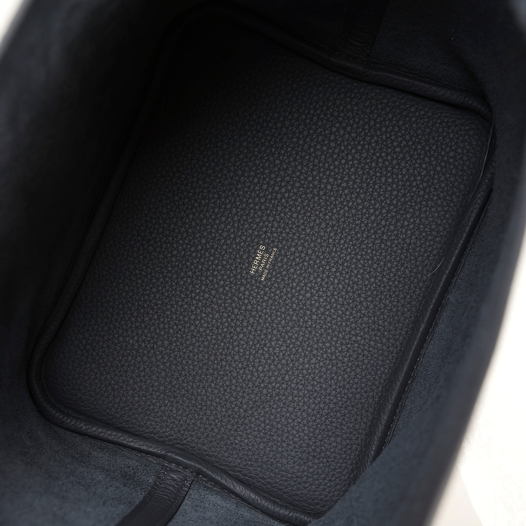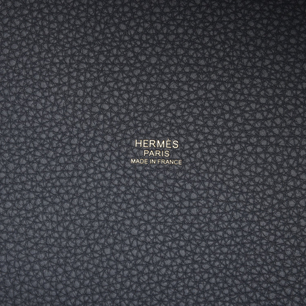 This Picotin is in Ardoise Clemence leather with permabrass hardware and has tonal stitching with two top handles.The interior is lined with Ardoise natural leather, no interior pockets and has a pull through closure secured by padlock.Collection: WOrigin: FranceCondition: New and never worn (plastic on hardware)Accompanied by: Hermes box (damaged), Hermes dustbag, lock, two keys, carebook and ribbon Measurements: 8.5” width x 8” height x 6.5” depth; 7” handles