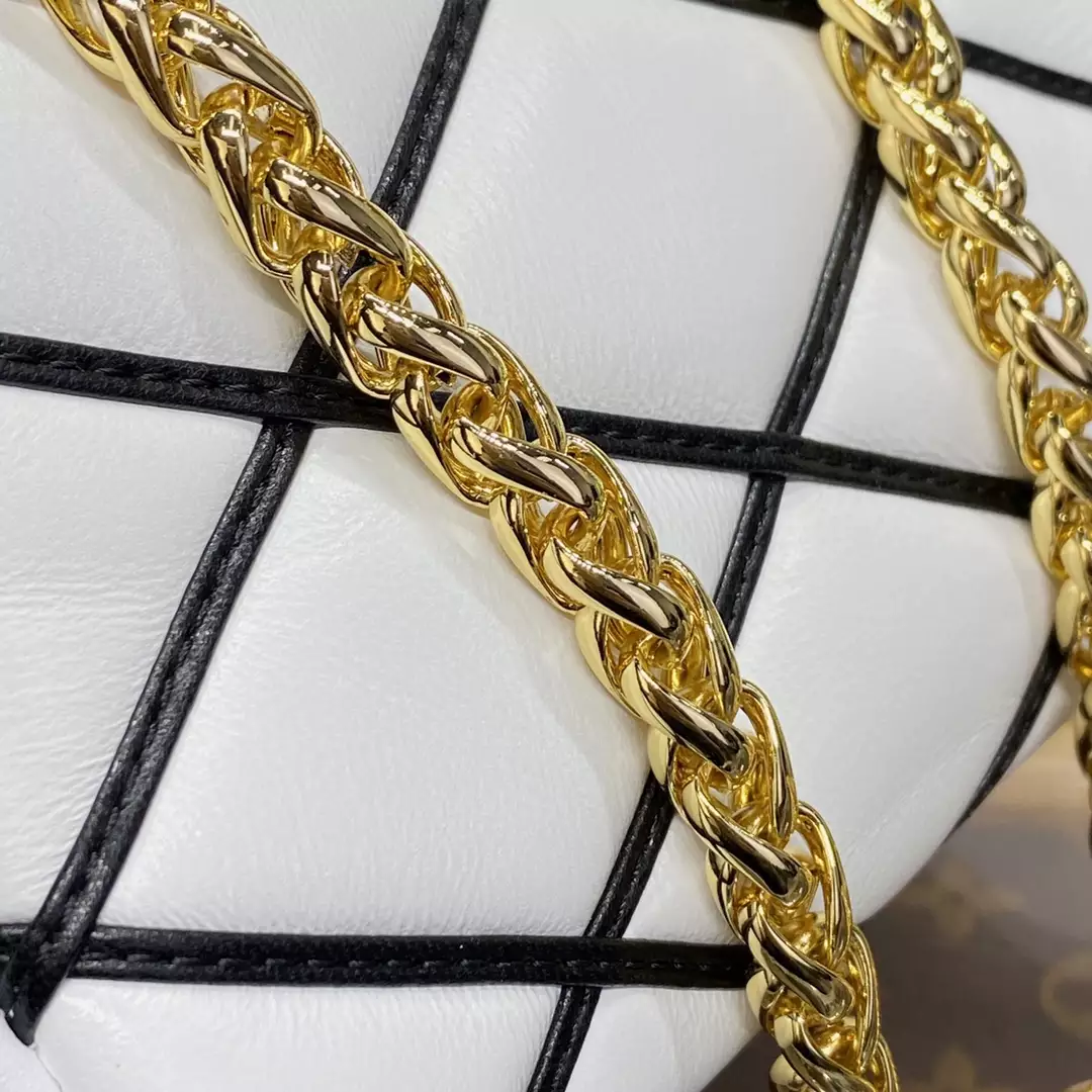 It features bold black-and-white colors and gold hardware, including the LV Twist lock on the flap.