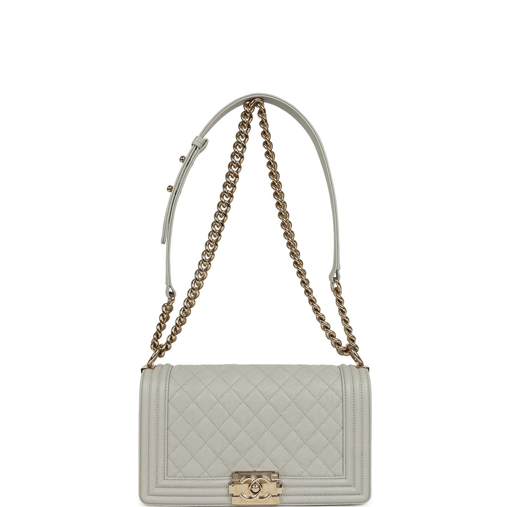 Pre-owned Chanel Medium Boy Bag Grey Shiny Caviar Light Gold Hardware Shop for an authentic pre-owned Chanel Old Medium Boy Bag in grey shiny caviar leather with light gold hardware in mint condition at Madison Avenue Couture.