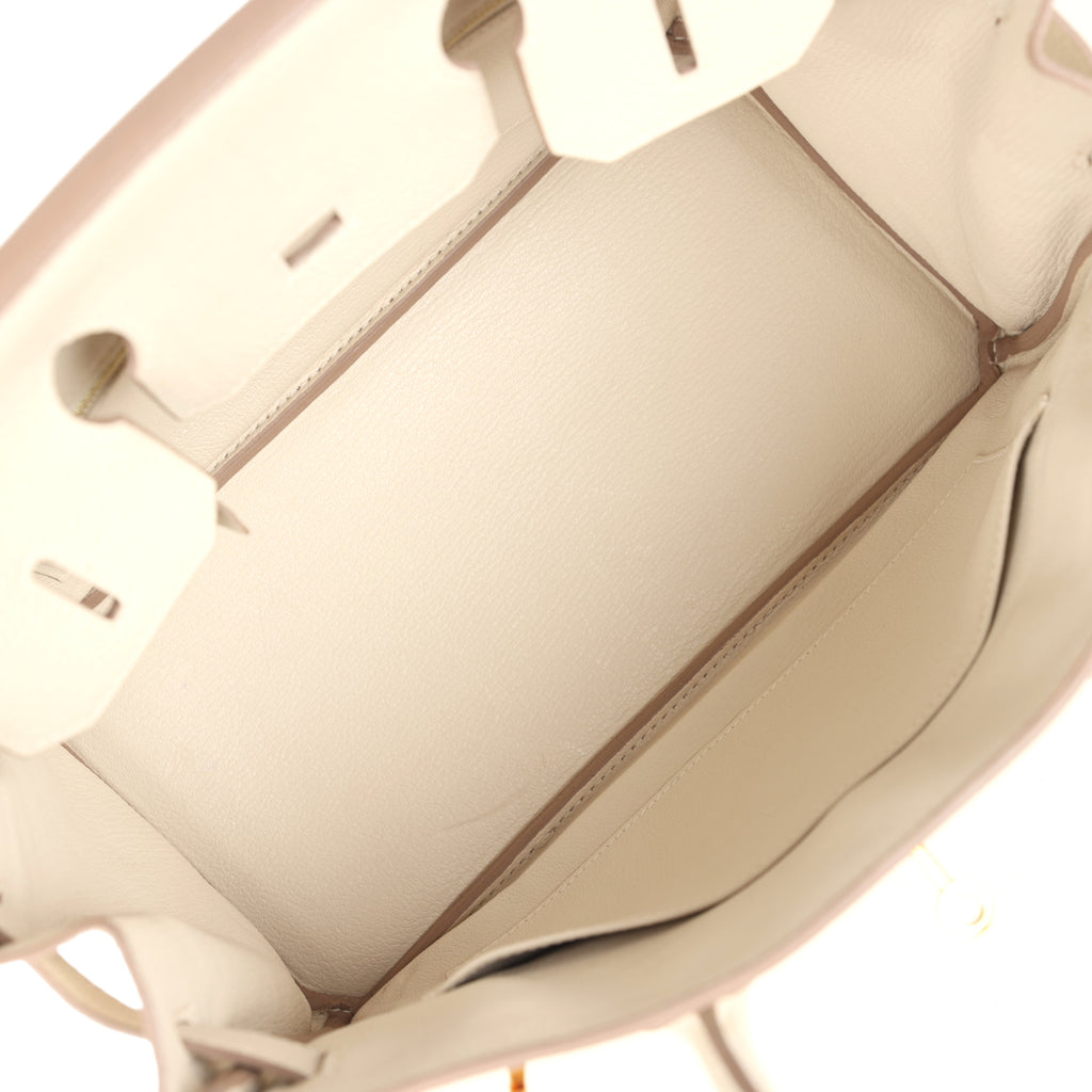 This Birkin is in Craie togo leather with gold hardware and has tonal stitching, front flap, two straps with center toggle closure, clochette with lock and two keys, and double rolled handles.The interior is lined with Craie chevre leather and has one zip pocket with an Hermes engraved zipper pull and an open pocket on the opposite side.e.Collection: C (2018)Origin: FranceCondition: Pre-owned; Excellent – This bag retains its shape structure. There is no plastic on the hardware. There are moderate scratches to the exposed hardware. The hardware rivets are discolored. The lock also has moderate scratches. The exterior leather has a faint scuff/scratch on one of the side panels near the bottom of the bag. The interior leather has a scuff mark to the interior base and there are scratches to the leather on the front interior wall above the open slit pocket.Accompanied by: Hermes box (pre-owned), Hermes dustbag, clochette, lock, two keys, carebook, rainhatMeasurements: 11″ width x 9.5″ height x 4″ depth; 4″ handle drop
