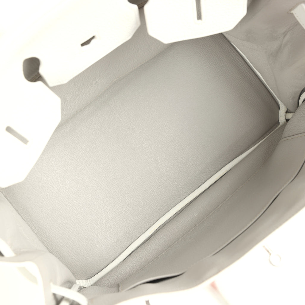 Pre-owned Hermes Birkin Club 35 White and Gris Perle Clemence and Sanguine Lizard Palladium Hardware Shop for an authentic pre-owned Hermes Birkin Club 35 in White and Gris Perle Taurillon Clemence leather with Sanguine Lizard and palladium hardware in excellent condition at Madison Avenue Couture.