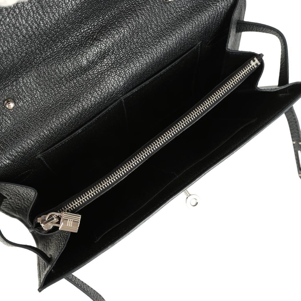 This Kelly Wallet To Go is in Black Chevre Mysore leather with palladium hardware and has tonal stitching, two straps with front toggle closure and removable crossbody strap.The interior is lined with Black Chevre Mysore leather and two main compartments with four credit card slots and a zippered center compartment with Hermès H lock pull.Collection: Y (2020)Origin: FranceCondition: Pre-owned; Excellent – This bag has some waving to the sides and pull straps from wear. There is no plastic on the hardware, resulting in moderate scratching present. The exterior leather has faint marks throughout that are visible in certain lighting. The interior leather has some faint marks throughout, notably on the sides. The “lock” zipper pull has no silicone protector, resulting in some light scratching.Accompanied by: Hermes box, strap, strap dustbagMeasurements: 8″ width x 4.5″ width x 1″ depth; removable strap: 21″