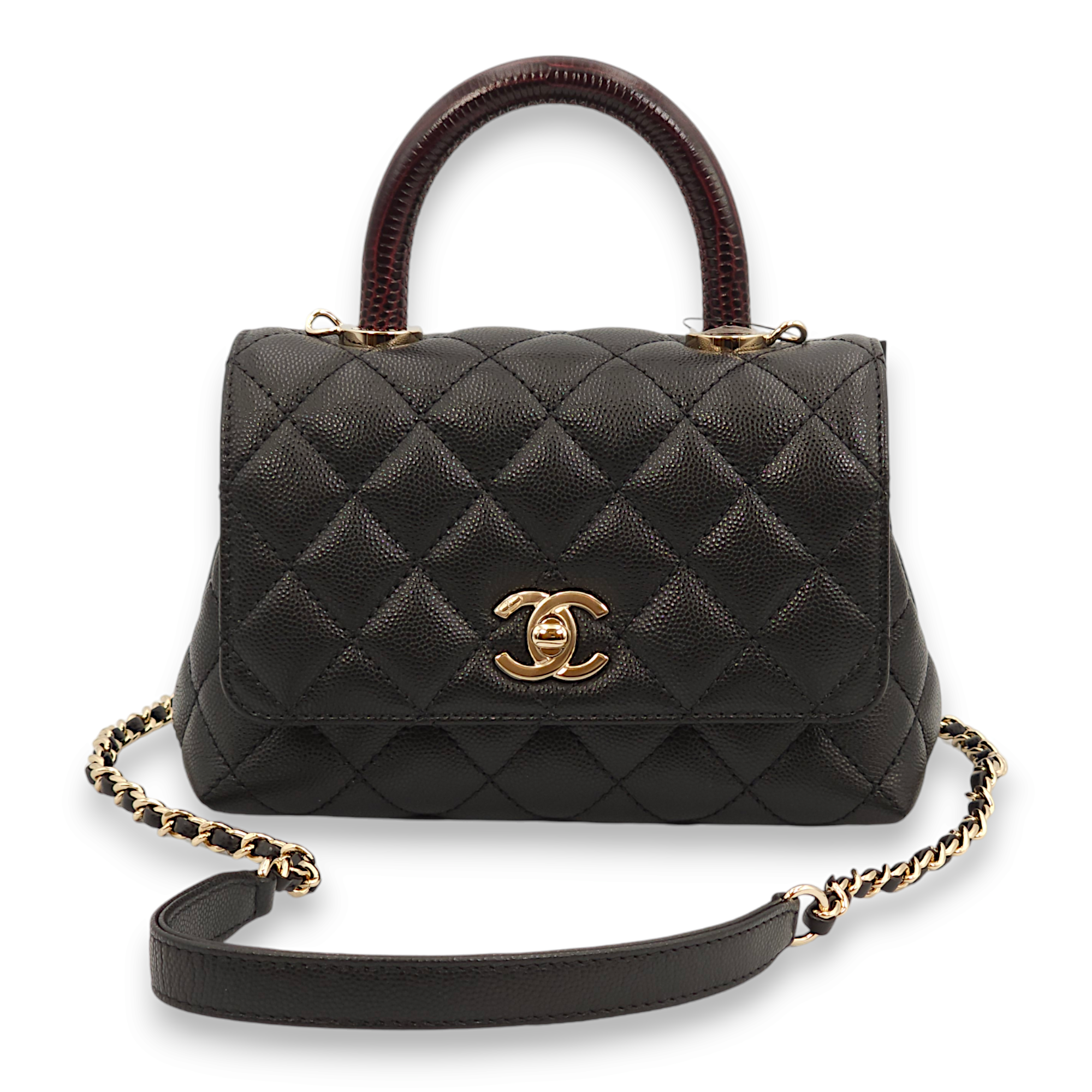 Quilted Coco Handle (19cm) Mini Black/Burgundy Handle Top Handle Bag in Caviar Leather, Gold hardware