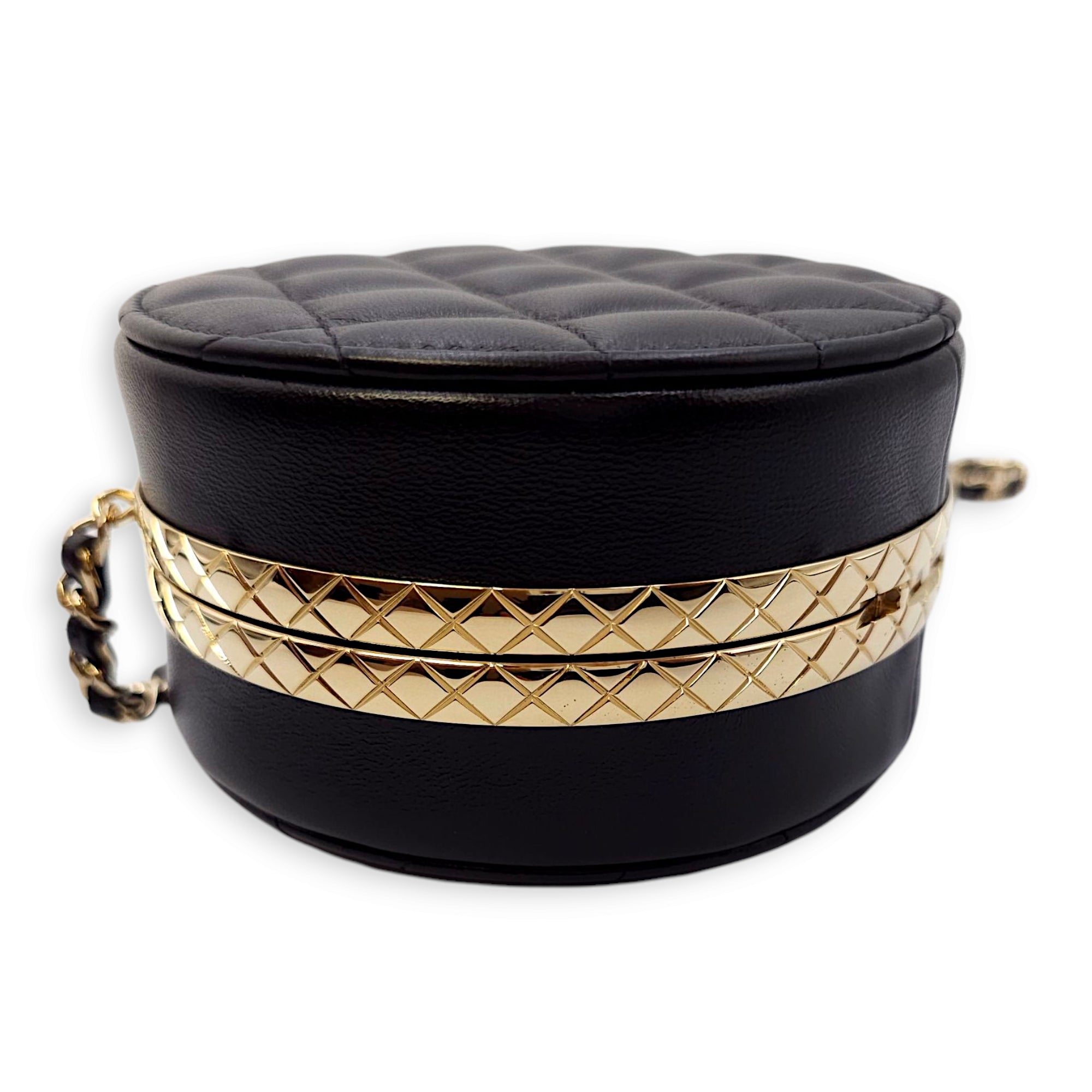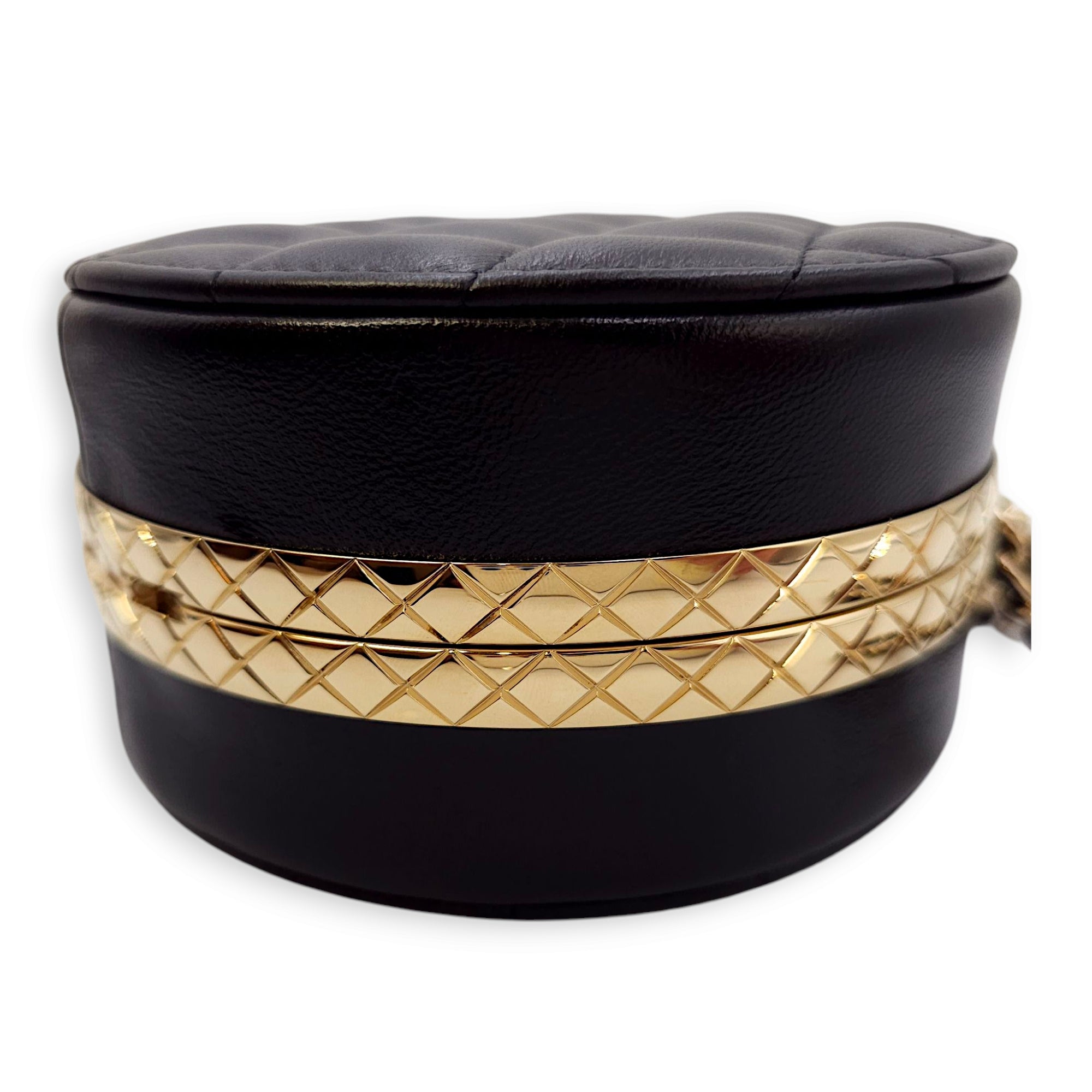 Quilted Filigree Chain Around Circle Black Crossbody Bag in Lambskin, Gold hardware