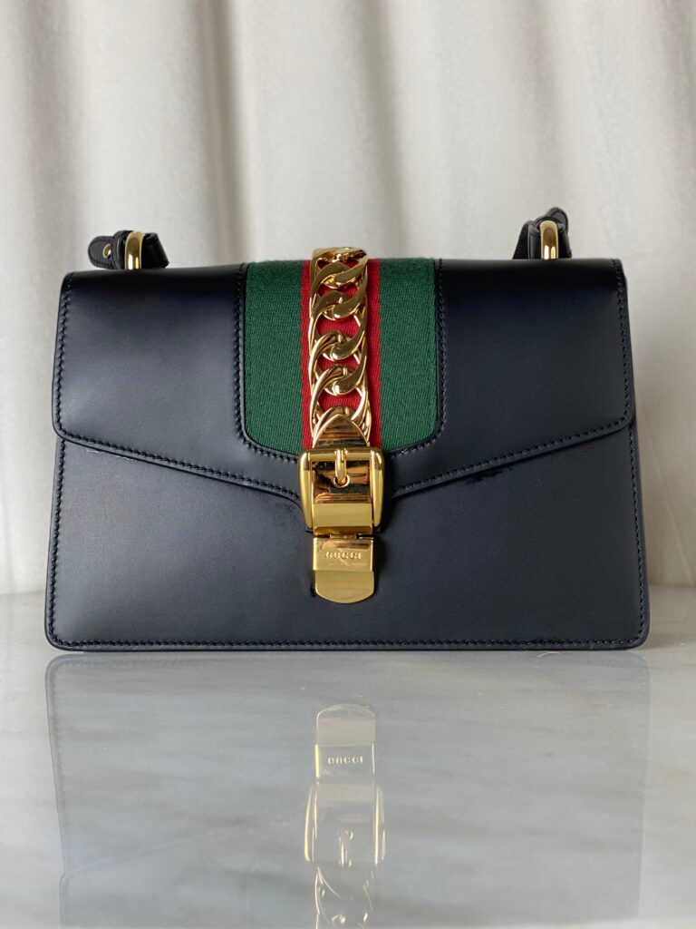 Made of black calfskin with Macrocannage stitching, it has a roomy inside and comes with a matching pouch to keep things organized.