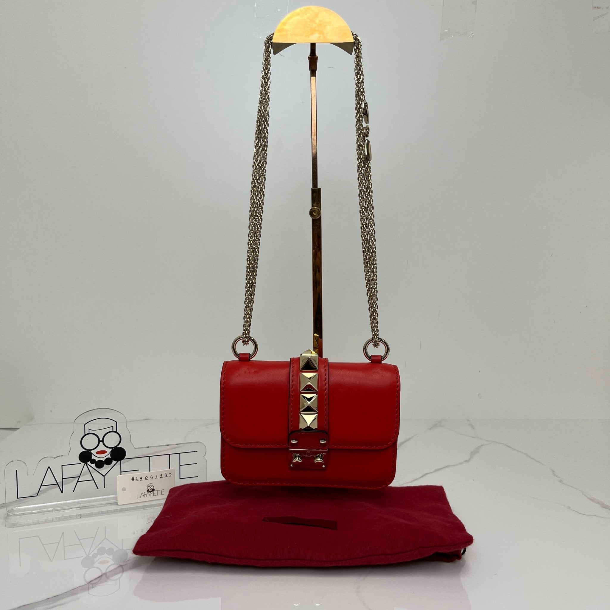 Make a fiery statement this season with the Valentino Rockstud Glam Lock in vermillion. Perfectly on-trend, this lambskin bag with signature rockstuds adds a splash of bold color and luxe texture to your wardrobe, ensuring you capture the spotlight wherever you go.