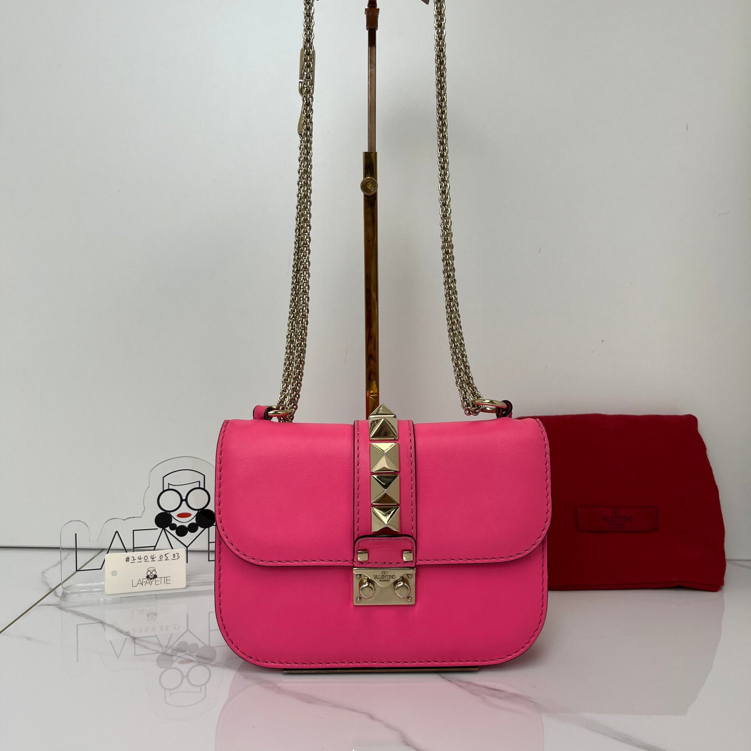 Flaunt your flair for fashion with the Valentino Small Rockstud Glam Lock bag in soft pink lambskin. This exquisite piece blends iconic Rockstud detailing with a versatile, chic design, perfect for elevating any outfit from casual daywear to sophisticated evening looks.