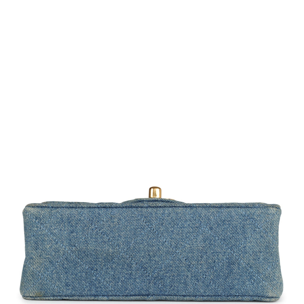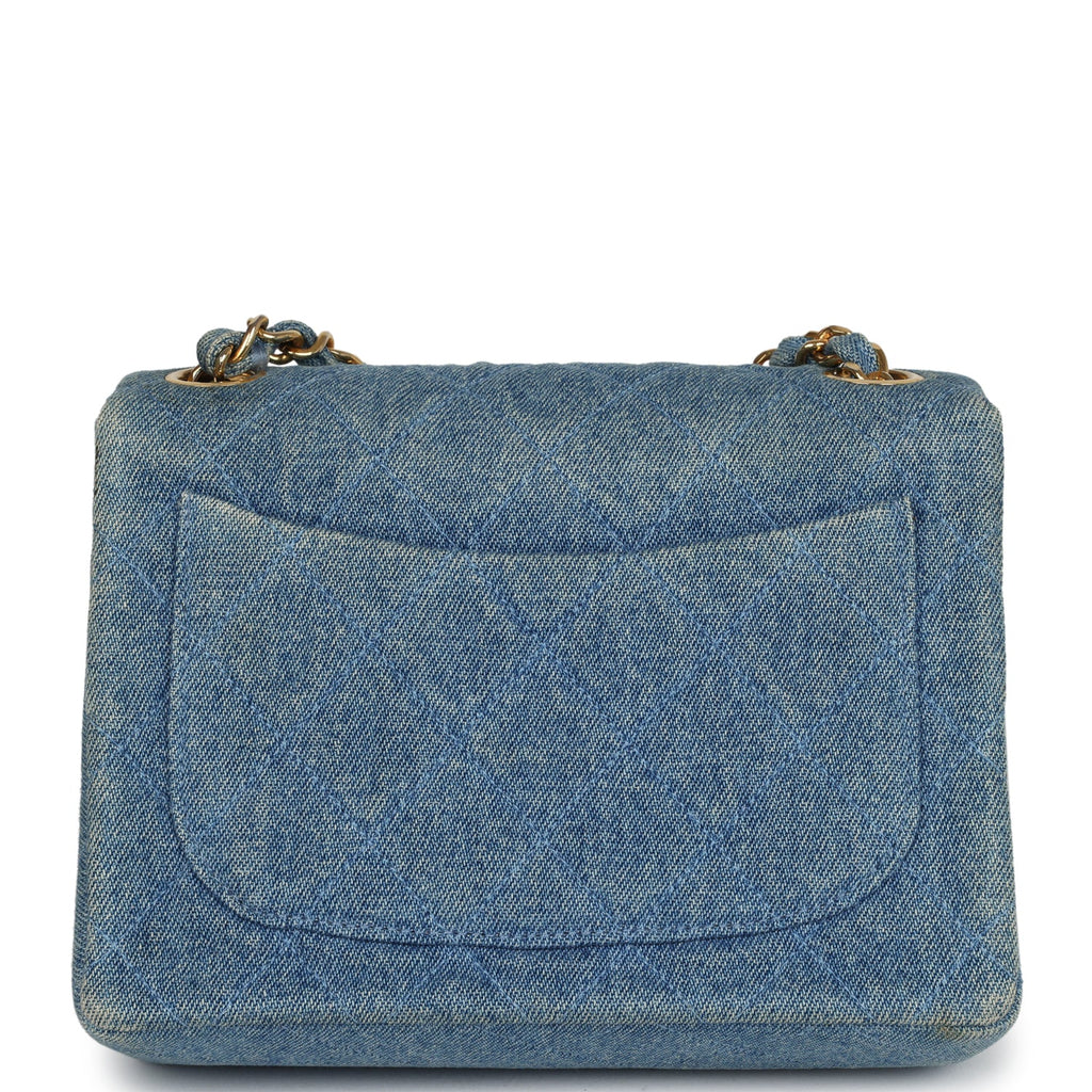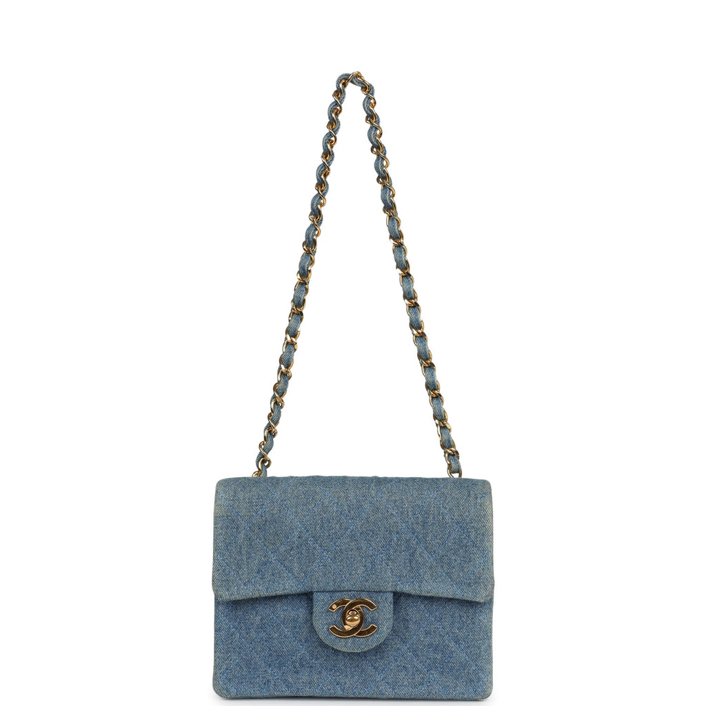Vintage Chanel Mini Square Flap Bag Blue Denim Gold Hardware Shop for an authentic Vintage Chanel Mini Classic Square Flap in blue denim with gold hardware in excellent condition at Madison Avenue Couture.