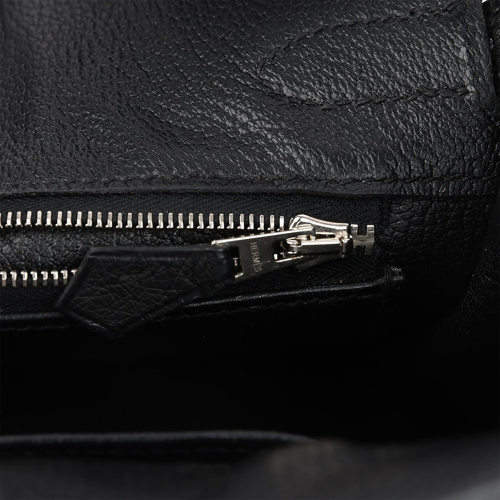 This vintage Birkin is in Black ostrich leather with palladium hardware, featuring tonal stitching, front flap with two straps, front toggle closure, clochette with lock and two keys, and double rolled handles.The interior is lined in Black chevre leather and has one zip pocket with Hermes engraved pull; pocket on opposite side.Collection: K Square (2007)Origin: FranceCondition: Vintage; Excellent – This bag is slightly relaxed in shape structure. There is no plastic on the hardware. There are moderate scratches throughout to the exposed hardware. The exterior leather has a small scuff near the front bottom corner on the exterior base. The exterior edge paint/resin has some signs of wear on the pull straps and top handles. The interior leather is clean but due to age of bag and storage, there is a faint odor.Accompanied by: Hermes dustbag, clochette, lock, two keys, clochette dustbagMeasurements: 11.75″ width x 9.5″ height x 8″ depth; 4.25″ handle drop